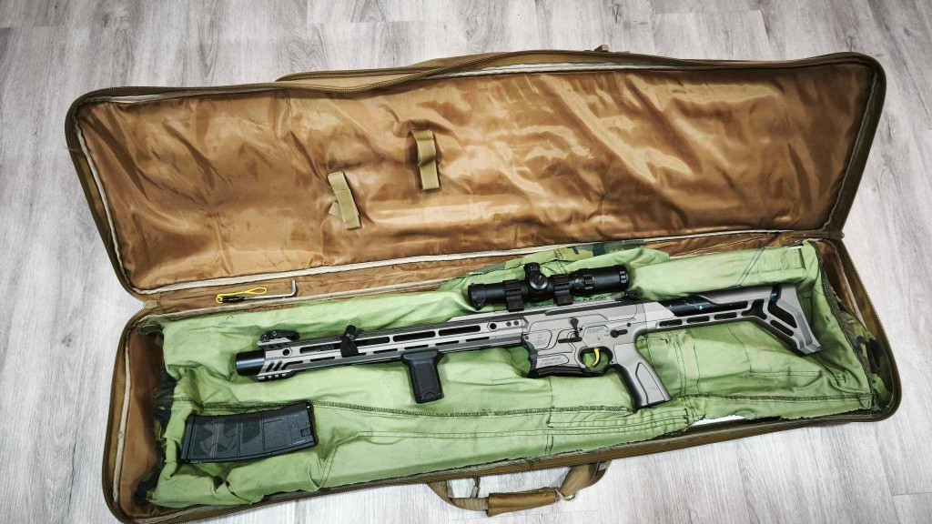 Zbraň v lehkém upu (už si nepomatuji co přesně), CNC tělo je v šedém odstínu, spoušť je eloxována ve zlaté barvě, všechny díly zbraně jsou kovové (s výjimkou výhozího okénka). Tedy i díly, které jsou běžně z plastu, jako např. pažbička či pažba. Na těle zbraně naleznete kromě sériového čísla také ražení výrobce. 70% zesílení skeletu mechaboxu v nejnamáhanějších místech * Rychlá výměna pružiny (quick change spring) Dvojité těsnění na hlavě válce a trysce pro vyšší výkon Oboustranný přepínač střelby i uvolnění zásobníku pro rychlejší obsluhu Odpojení motoru v případě nezaloženého nebo prázdného zásobníku Vylepšená šikmá ozubená kola pro vyšší výkon, nižší zahřívání a spotřebu elektřiny. Ke zbrani 1x originální zasobník a 6x guarder tlačný zásobník, tělo je celokovové bez sebemenší vůle (nikdy jsem neměl kvalitnější tělo v ruce) na zbrani je zapuštěný tlumiš a grip na předpažbí, optika strike systems 1-4 x 24 která stojí 3tis, ke zbrani vše co je na fotce https://www.anareus.cz/cs/optiky-puskohledy-a-lpvo/11275- optika-1-4-x-24-s-montkrouzky-s-podsvicenim-krize- STRIKE070.html