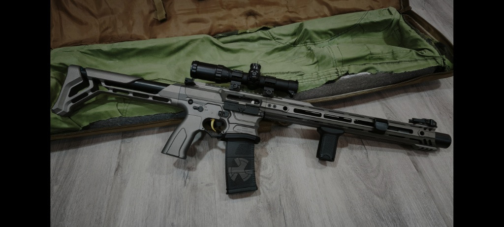 Zbraň v lehkém upu (už si nepomatuji co přesně), CNC tělo je v šedém odstínu, spoušť je eloxována ve zlaté barvě, všechny díly zbraně jsou kovové (s výjimkou výhozího okénka). Tedy i díly, které jsou běžně z plastu, jako např. pažbička či pažba. Na těle zbraně naleznete kromě sériového čísla také ražení výrobce. 70% zesílení skeletu mechaboxu v nejnamáhanějších místech * Rychlá výměna pružiny (quick change spring) Dvojité těsnění na hlavě válce a trysce pro vyšší výkon Oboustranný přepínač střelby i uvolnění zásobníku pro rychlejší obsluhu Odpojení motoru v případě nezaloženého nebo prázdného zásobníku Vylepšená šikmá ozubená kola pro vyšší výkon, nižší zahřívání a spotřebu elektřiny. Ke zbrani 1x originální zasobník a 6x guarder tlačný zásobník, tělo je celokovové bez sebemenší vůle (nikdy jsem neměl kvalitnější tělo v ruce) na zbrani je zapuštěný tlumiš a grip na předpažbí, optika strike systems 1-4 x 24 která stojí 3tis, ke zbrani vše co je na fotce https://www.anareus.cz/cs/optiky-puskohledy-a-lpvo/11275- optika-1-4-x-24-s-montkrouzky-s-podsvicenim-krize- STRIKE070.html