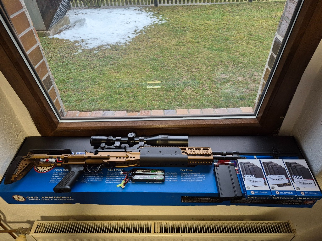 Zdravím, nabízím zde novou AEG M14 EBR-L od G&G (verze s ETU). Zbraň mi dorazila 10.3. Z Evike. Cena zbraně (vč tocneho zásobníku) je 14.300,- (je to stejná cena jako verze bez ETU na CZ shopu. Na cz shopu tuto verzi seženete za 17000) K tomu jsem sehnal nové 3 zásobníky (tlacne 120ran) a 2x 11.1V lipo baterie (3800,- celkem). Zbran tu nabízím protože jsem se unahlil a koupil poslední kus z evike, ale po vyzkoušení mi nesedí. Nabízím to tu bud k prodeji (z ceny nebudu ustupovat. Je to nový kus a už jsem si vytrpel dost se clem), nebo k výměně za pěknou plynovku (ar platforma) nebo HPA. Prosím nenabizejte mi žádné HPA odstrelovacky. Na nabídky pod cenou ani nebudu reagovat. Můžu zaslat nebo osobně předat liberec, okolí až Praha. Cena zbraně se zásobníkem je 13990 a k tomu nabízím i nové 2x 11.1V lipo za 1200,- a 3x tlačný zasobnik za 2600,- Pokud budete chtít i optiku tak za 1500,-