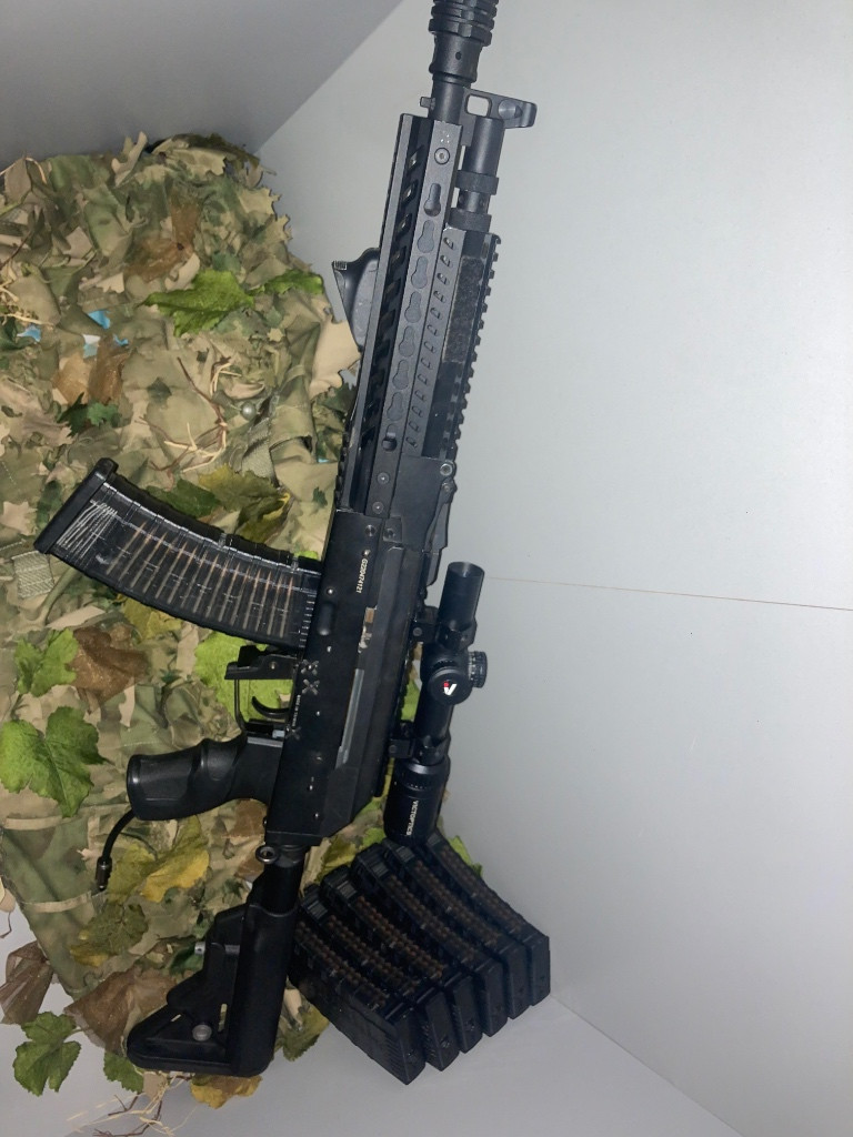 Zdravím prodávám své (ak-105) Rk74 elite od G&G v hpa úpravě s Polarstar kythera. maple leaf 6.02 haveň, gumička G&G, momentálně na zakladní hopup komoře, přidám retroarms cnc komoru, 7x tlačný 110ranný zásobník. Prodávám kvůli penězům na nový kvér. 1.7J na 0.32 100psi Přidám po domluvě i vectoroptics Ipvo. pořizovací cena kompletu 20tis. Cena 12 0000 Osobně Brnířov nebo zásilkovna. (poprosím kontaktovat na tel.číslo nebo sms)