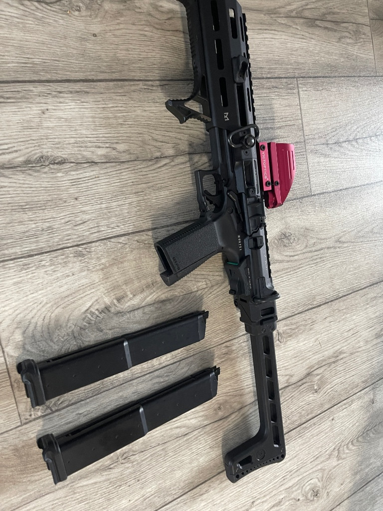 Prodám toto plynové smg G&G SMC-9, zbraň je defakto nová, téměř nehraná. Ke zbrani je 2x zásobník a kolimátor VictoOptics Z3. Pořizovací cena kompletu byla 11948 Kč, nyní prodávám za zlomek původní ceny. Zbraň kvůli konci s airsoftem, z důvodu narození dítěte, tudíž výměna není možná, pouze prodej