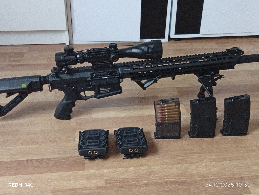 Dobrý den, Prodám svou airsoftovou zbraň. Z důvodu nedostatků časů na upgrade do HPA systému. Zbraň je připravená na vložení HPA jednotky např. F2 apod. mechabox G2H s rychlouvyměnou pruž. ( má záchyt závěru) Optika: 4x12x50 CNC hopUp komora Maxx model M4G Hlaveň Ra-Tech 410x6.01mm HopUp gumka ML MR 60 VSR/GBB Zpoušť Maxx Model k tomu nechám tří zásobniky 100,100,40bbs Typu 7.62x51 a dvě sumky. Prosím jen vážný zájemce, preferují osobní předání (Nereagují na e-mail typu mohu poslat kurýra!!!) Neposílám přes balíkovnu, zasílkovnu apod. Cena je pevná