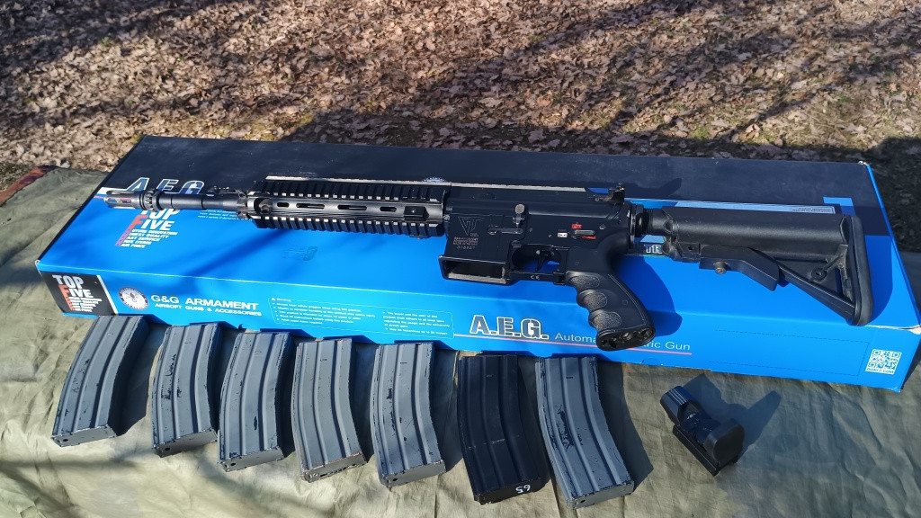 Softu zdar! Z důvodu nedostatku místa redukuji svou sbírku a nabízím k prodeji zbraně, pro které nemám využití. Nabízím G&G variaci na HK 416, top tech řada. Zbraň je celokovová, velmi pekně zpracovaná a má elektrický blow back - trochu to mění pocit ze střelby oproti klasickým AEG. Zbraň má výkon 1,7J, a je v ní nainstalován Jefftron Leviathan V2 optical. Zbraň je pravidelně udržovaná, nicméně několik měsíců nehraná. Ke zbrani přidávám red dot s možností volby záměrného kříže (tečky), 6 midcap zásobníků a jeden točák. A taky původní krabici :). Zbraň má pár oděrek, ale celkově slušný stav.