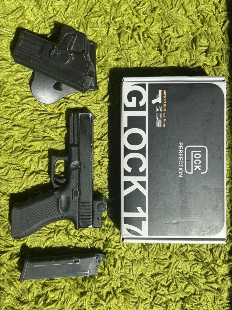 Zdravím. Prodám airsoftový Glock 17 Gen4 se všemi detaily, vybavený plně funkčním red dot zaměřovačem pro rychlé a přesné míření. Pistole má nějaké ty provozní oděrky, ale je stoprocentně funkční. Zásobník těsní a podává bez problémů. Součástí prodeje je pouzdro na opasek zdarma a originální krabice. pořizovací cena kompletu byla necelých 6000Kč, nechám za 3500Kč. Zbraň je vyčištěná, namazaná. Na dotazy rád odpovím.