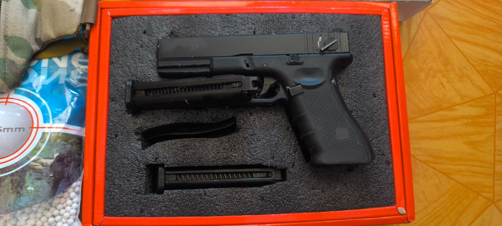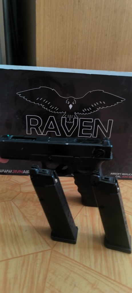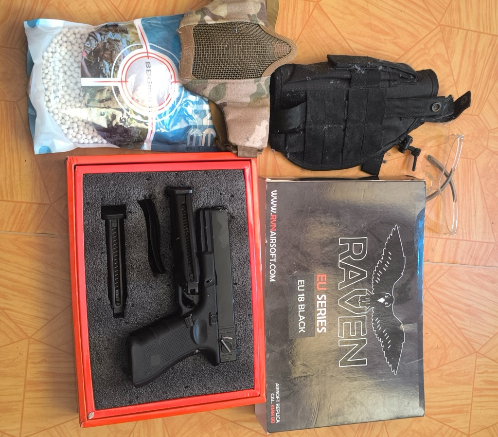 Glock 18 (airsoft) — Raven + příslušenství — 3 000 Kč (možno sleva) Prodám airsoft pistol Raven — model Glock 18. Stav: lehce použitá (na povrchu jsou drobné známky používání, nic zásadního). Součástí setu: 2 zásobníky, pouzdro, brýle, maska, 1× neotevřené balení 6mm BB. Pistole funguje, stačí dokoupit plyn a je připravená k použití. Vhodné pro začátečníky i pokročilé. Cena: 3 000 Kč za celý set — při rychlém jednání možná sleva. Možnost zaslání přes Zásilkovnu (+80 Kč) nebo osobní předání Napajedla / Otrokovice / Zlín. Pro více info napište zprávu.