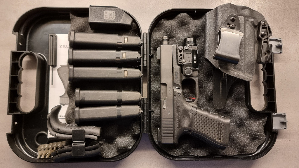 Zdravim, prodám Glock 19 (G19) gen.4 s hlavní se závitem s příslušenstvím viz foto: Zbraň, zakázkový appendixový holster FUPA od Renaissance Firearms, 2x 15r zásobník, 3x 17r zásobník, nabíječ zásobníků, nástroj pro demontáž vnitřností, 4x vyměnitelné hřbety, čištění a kufřík. Úpravy na zbrani: mířidla Truglo TFX Pro (+přidám originální), svítilna s laserem Viridian X5L gen.2, fešný jazýček spouště (jenom jazýček – táhlo je originál + přidám i originální jazýček). A to je vše, jinak je zbraň v tovární konfiguraci „GLOCK perfection“. K samotné zbrani. Jsem první majitel, koupena v roce 2015 v Libereckém ARMY ARMS. Na svůj věk má nastříleno poměrně málo, jen cca 3k ran, všechno S&B. Z estetického hlediska má trochu ohoblované tělo v levé horní zadní části (kolem kloubu palce) a vepředu na levé straně závěru má trochu poškozenou povrchovku a vyryté 2 zářezy. Cena 19k. Vyzkoušení/předání v Pardubicích, případně dle domluvy.