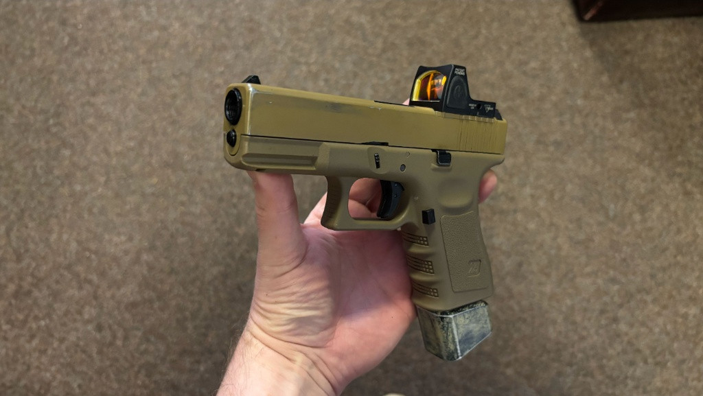 Popis:Glock 19 WE + RMR + 7 zásobáčků