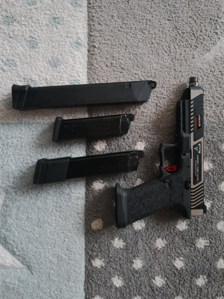 Končím se softem, tak pouštím do světa. Glock 34 od firmy EMG, glock Johna Wicka. Zbraň mám pár měsíců, stihla jen dvě akce. Ve zbrani je hop komora guarder, hop gumka maple leaf decepticon, spoust od tti airsoft cnc nastavitelná. Ke zbrani jsou tři zásobníky, krátký a dlouhý na 50 ran, třetí je origo na co2. Přihodim zbytek bombiček. Cenu nějak rozumně nabícněte