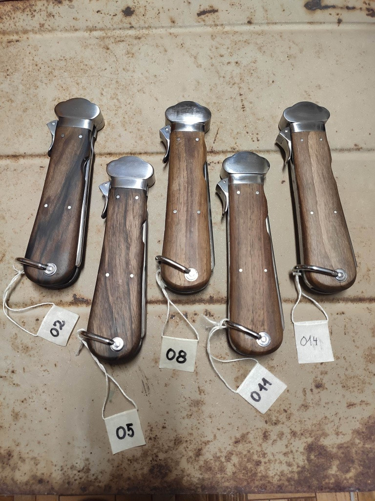 Prodám repliky 1. modelu gravitačních nožů Luftwaffe. Materiál nerez. Střenka ořech. Není nabroušena fazeta (ostří). Logo výrobce SMF. Pouze kusy 02 / 05 / 011 / 014. Cena 10 000Kč/kus.