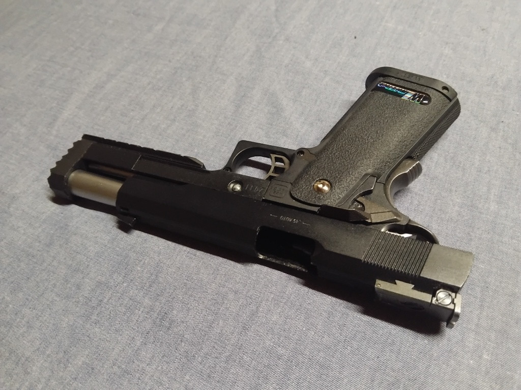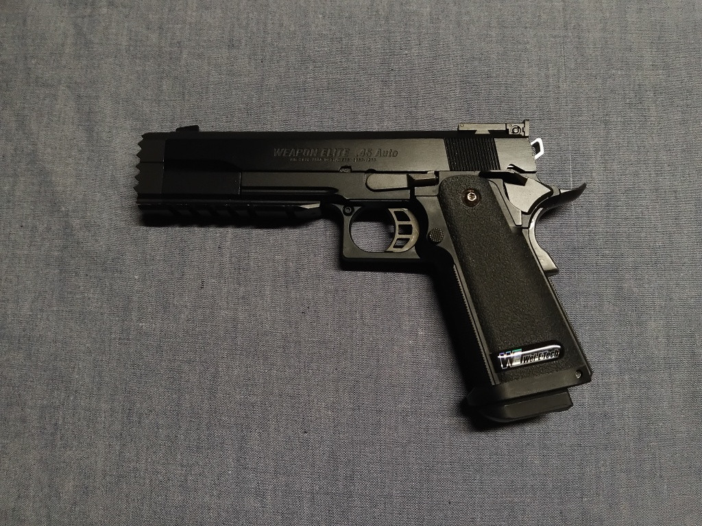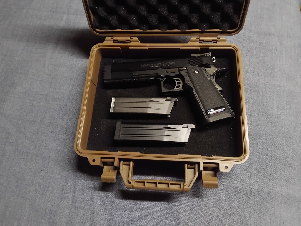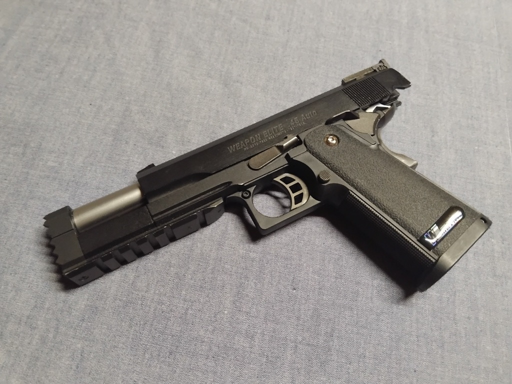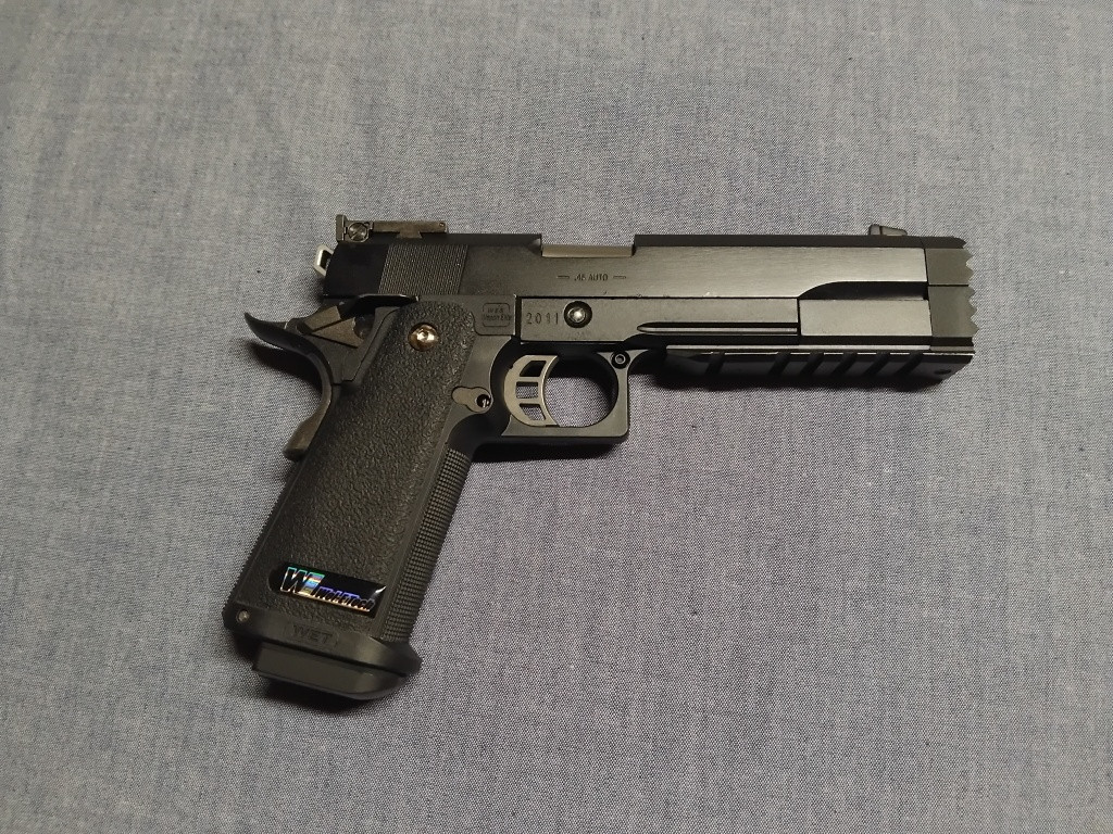 Plynová blowbacková airsoftová replika pistole Hi Capa od výrobce WE. Zbraň byla upravena - vyfrézovaný závěr a fixovaná hlaveň, která při pohybu závěru zpět neklesá (pro zvýšení přenosti a zlepšení chodu) a modifikovaný vnitřní mechanismus. Pistole střílí full auto (plně samočinně - po zmáčknutí spouště do jejího uvolnění nebo vyprázdnění zásobníku). Narozdíl od TM verze zůstane závěr v zadní poloze po vystřelení poslední kuličky (zbraň tak nestřílí naprázdno). Z pistole je tak kapesní samopal (vysoká kadence a zábavná střelba). Celokovové provedení, lišta pod hlavní + strike face, který fixuje hlaveň v poloze. Dva zásobníky na green gas, jeden standardní se sníženou botkou, druhý zkrácený, který se zcela schová v rukojeti (bez problémů jde vložit i vyjmout). Bytelný transportní kufr v pískové barvě s polstrováním. Zbraň je nová a nepoužívaná, pouze otestovaná vystřílením několika zásobníků. Cena plus pošta nebo osobní předání Praha / Louny.