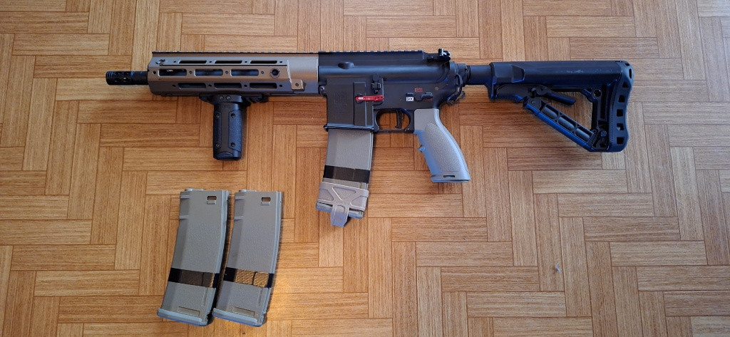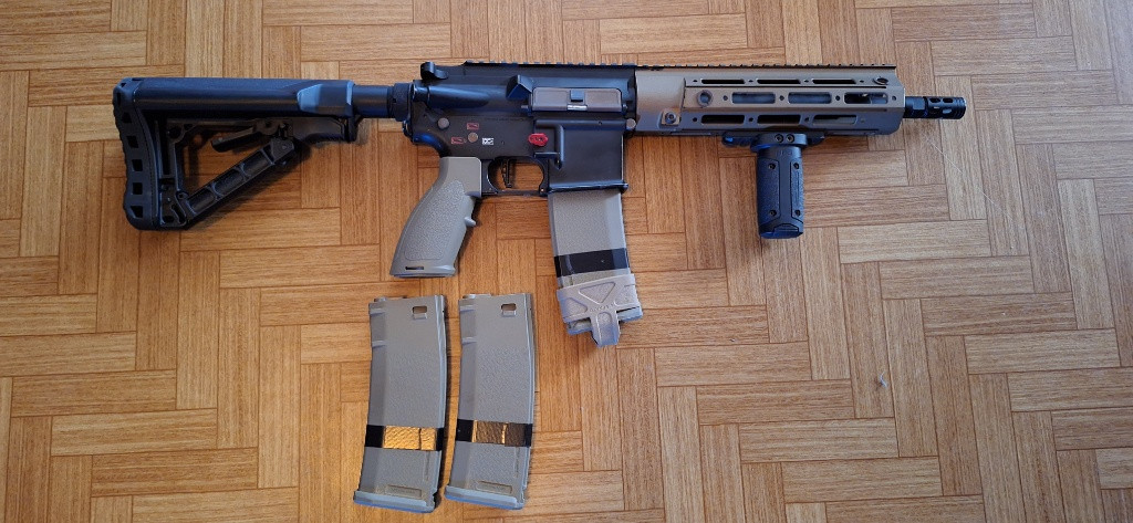 Prodávám svou 416, stará dva roky. Plně funkční, vnější tělo nese menší známky používání. Uvnitř vše originální, pouze změněna pružina na M115, výkon 1,54J. Ke zbrani 4 zásobníky, původní krabice. MAXX CNC záchyt zásobníku, původní uvolňoval zásobníky během střelby. Pažba na fotce je GOS V3 od G&G, mám i původní. Originální krabice. Dvě RIS lišty. Konektor Dean-T