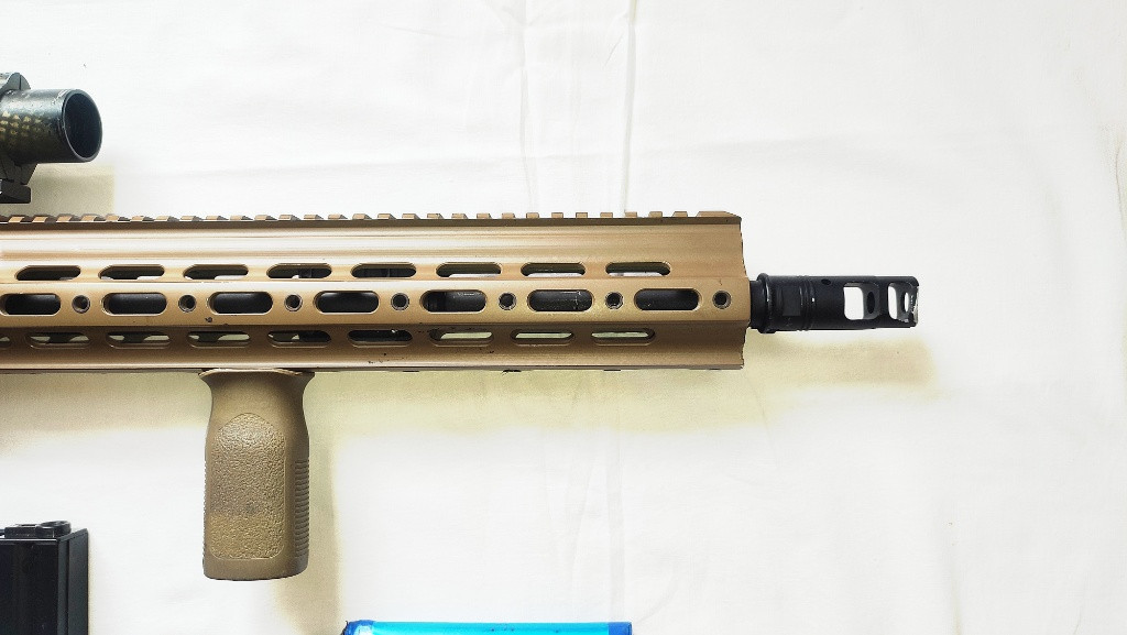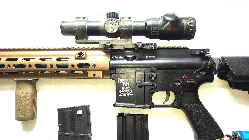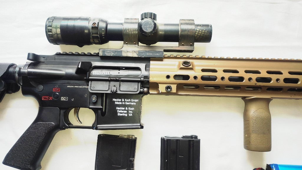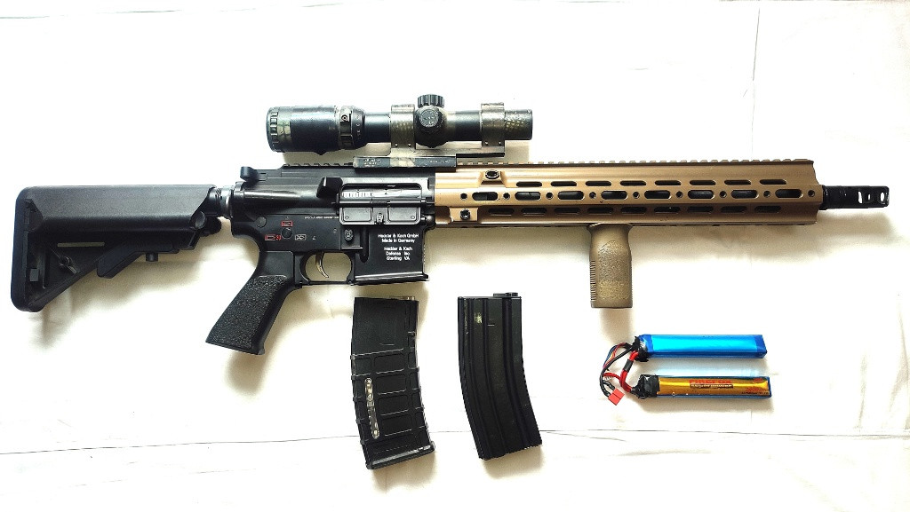 Prodám "dlouhou" HK 416 postavenou jako tzv. Recce Rifle, u CAG používaná jako alternativa DMR pušek s výhodou kratší hlavně (14,5 inch). Je to další z kousků k jednomu z mých CAG kitů. Ve zbrani je upgrade pro úsťovou rychlost 150 m/s. Ve zbrani je niklovaná či chromovaná 6,03 mm hlaveň (bohužel výrobce již nejsem schopen dohledat - pravděpodobně je to ale SRC), hop-up komora ProWin, hop- up guma Madbull, kola AirsoftPro, komplet vzduchotechnika SHS, pružina Guarder SP130 s progresivním vinutím. RetroArms CNC V2 mechabox. Mosfet Jefftron. Puška je osazena LPVO od firmy Visionking. Domeček na přisvícení záměrného bodu se bohužel odlomil, je to zakryté pruhem gumy. Na funkci to nemá vliv. Motnáž, kterou je optika přichycena ke zbrani je kopie LaRue 1,5 QD Mount (včetně značení). Ke zbrani jsou dva točné zásobníky na 300 ran a jeden Li-Pol akumulátor 11,1 V, 2.400 mAh, který se vejde do Crane Stocku. Zbavit se toho úplně nepotřebuji. Ale zase je škoda, aby mi ležela jen ve skříni, když by někomu mohla ještě udělat pěknou parádu. Cena 12.000,- Kč a nejednám o ní. Původní cena se vším co k tomu je, včetně upgrade, byla takřka dvojnásobná.