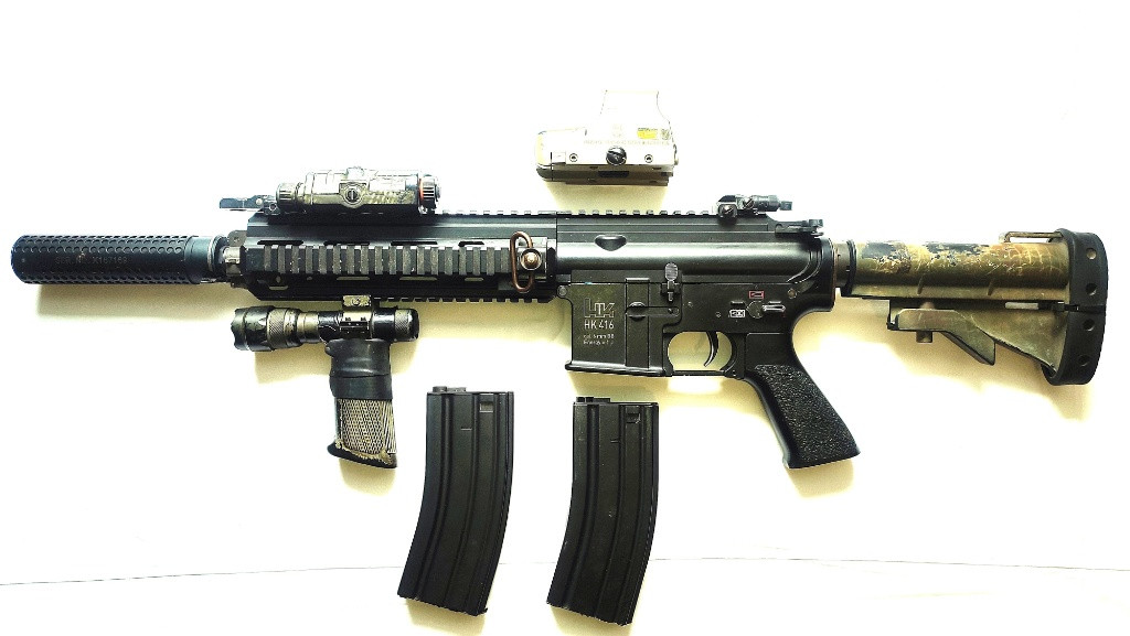 Prodám HK 416D z mého CAG kitu. Ve zbrani je upgrade pro úsťovou rychlost 120 m/s. V současné době už to bude spíš 110 m/s. Ve zbrani je SRC 6,03 mm hlaveň, hop-up komora ProWin, hop-up guma Madbull, kola AirsoftPro, komplet vzduchotechnika SHS, pružina SP110 s progresivním vinutím (pravděpodobně Guarder, ale to si už úplně nepamatuji). Mosfet Jefftron. Je to dělané na CQB. Aby to bylo spolehlivé a bezporuchové. Ke zbrani je tzv. Gangsta Grip se svítilnou (oblíbený u operátorů CAG v období 2001 - 2010). Atrapa AN/PEQ 15 (laser je funkční). Klasická Colt výsuvná opěrka s originálem botky John Masen Recoil Pad (rovněž oblíbená u CAG). Ke zbrani navíc přední a zadní mířidlo stylu KAC, jeden KAC QD Suppressor, dva točné zásobníky na 300 ran a jeden Li-Pol akumulátor 11,1 V, 1.200 mAh, který se vejde do trubky v pažbě. Přidám v případně zájmu zdarma kolimátor ThetaOptics (kopie EoTECHu 551). Zbavit se toho úplně nepotřebuji. Ale zase je škoda, aby mi ležela jen ve skříni, když by někomu mohla ještě udělat pěknou parádu. Je to víceméně raritní kousek s HK ražením. Cena 12.000,- Kč a nejednám o ní.