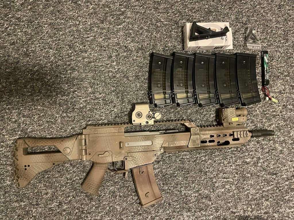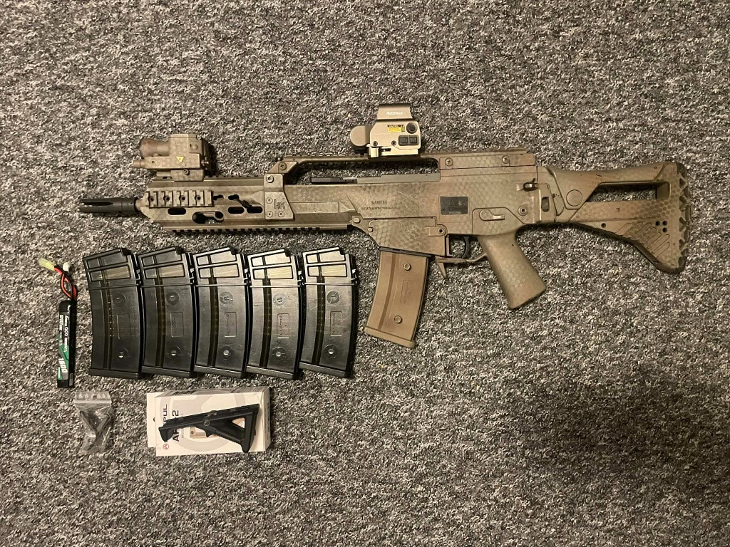 Plně funkční G36 postavená na KA4. Původní tělo Umarex Ares. Pažba, lišta, Mag release originál z ostré zbraně. Předpažbí kvalitní 3d tisk na zakázku. Uvnitř lepší hlaveň a mechabox upgradovaný. Přidám AFG grip od magpulu, zásobníky, lipo baterii co se vejde do předpažbí, funkční svítilnu a hodně jetou kopii Eotechu spolu s náhradním mag releasem. Poštovné zdarma nebo osobní odběr v Plzni.