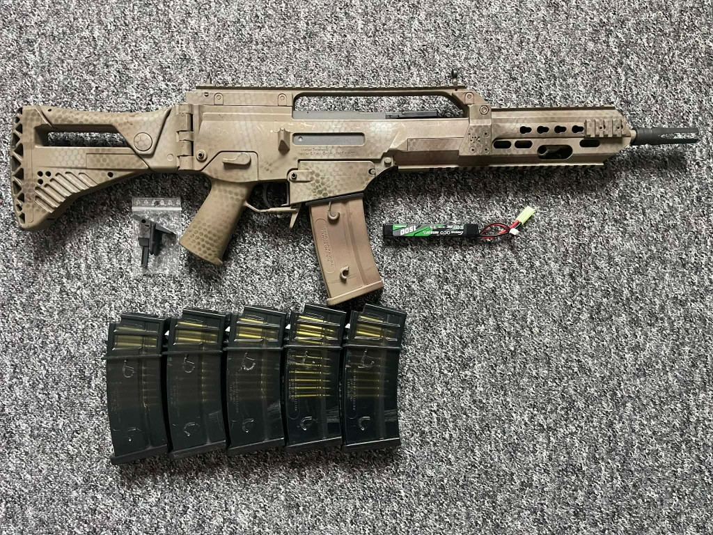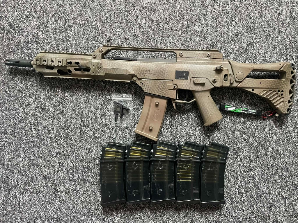 Plně funkční G36 postavená na KA4. Původní tělo Umarex Ares. Pažba, lišta, Mag release originál z ostré zbraně. Předpažbí kvalitní 3d tisk na zakázku. Uvnitř lepší hlaveň a mechabox upgradovaný. Přidám zásobníky, lipo baterii co se vejde do předpažbí, náhradní mag release a 3d tisk bolt catch. Poštovné zdarma nebo osobní odběr v Plzni.