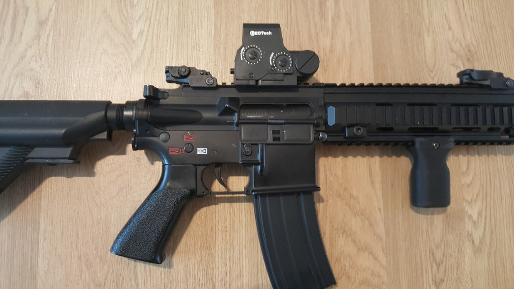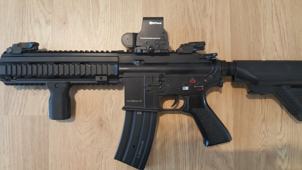Prodám HK416, celokov ve výborném stavu, v základu. Ke zbrani jednoduchý plastový Eotech, baterie, nabíječka a pytel kulí. Nový točný zásobník od Specna Arms.