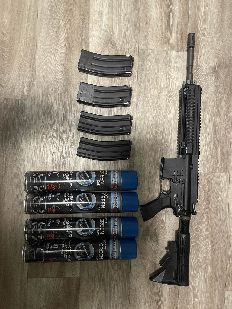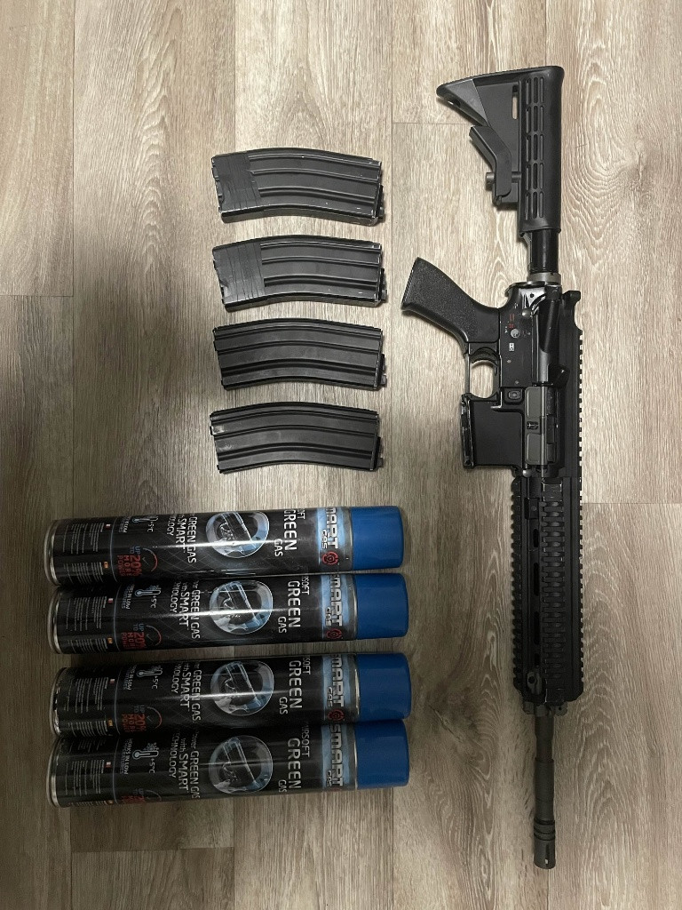 Zdravím, prodávám tuhle hk416 od firmy WE, hraná byla naposledy v létě na 3x akcí, vše je v zakladu až na záchyt kladívka které je vyměněný za CNC, bude potřebovat koupit novou trysku, protože tato je prasklá, sice zbraň střílí, ale vynechává kvůli tomu, ale jinak je bezproblémová super hračka. K tomu přidam 4 zásobníky (všechny by měli těsnit) a k tomu 4x 750ml greengas lahve (jedna je tak ve čtvrtce, dvě v polovině a jedna skoro celá plná) Nevolejte telefon je vymyšlený, popř na dotazy vám rád odpovím v mail, děkuji za pochopení. HK416, GBB, gbb. Hk416, WE, We, we