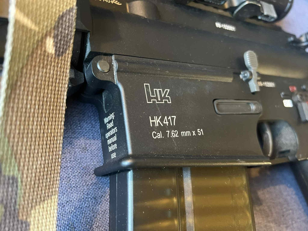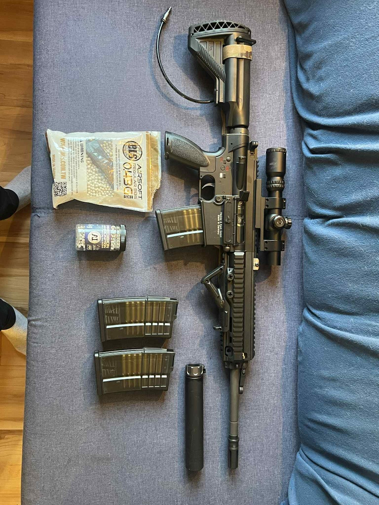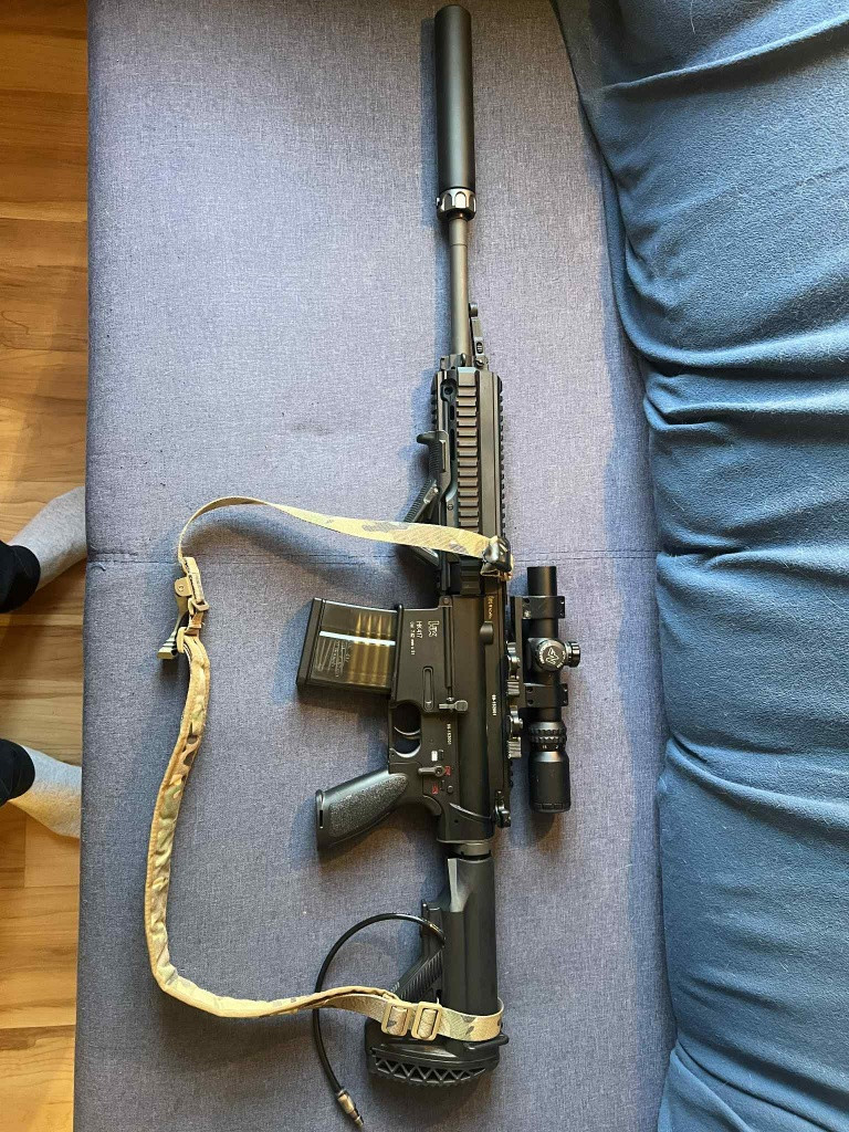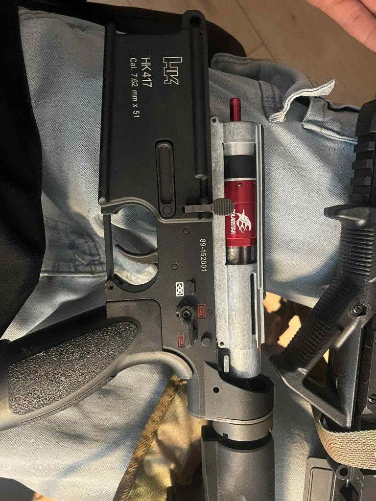 Prodám HK417 od Umarexu. Již téměř nesehnatelnou Bengházi edition. Zůstalo pouze tělo a skelet mechu. Uvnitř hlaveň KM HEAD 6,04mm protažená do konce kompenzátoru, Na zakázku dělaná 3D tisk redukce pro M4 komory, Silent Alpha CNC komora, Prometheus purple gumička a Polarstar F2 pro HK417. Složený a nastavený tak aby fungoval pouze safe a semi. Výkonnostně to bylo něco kolem 2,5-2,7J na 0,43g Bude třeba jí určitě ještě trošku doštelovat/poladit (pak bude dávat kolik si natočíte na kohoutu) Jinak spojka by měla být od US Foster (prostě to nejlepší co si můžete přát na konci hadice) a je protažená pažbou, tak aby nebyla moc vidět. K tomu AngryGUN 7.62 rychloupínací tlumič (vycpaný molitanem) s ražením v setu s ocelovým kompíkem s ražbou Surefire, Velice kvalitní kopie Magpul Angle gripu, Shortdot na nízkoprofil jednolité montáži s uzkoprofil věžemi, mildotem a NightForce krytkou. K tomu přidám 3x tlačný zásobník, baterku pro ECU a původní AEG vnitřní díly s origo krabicí ve které puška spala ve skladech. Ještě vám na pušce nechám Faraon popruh v multicamu s Magpull style okem na popruh. Zbraň byla venku jen jednou, od té doby leží (takže jako nová) PC: kolem 45K Nechám bez regulátoru a lahve, tak jak je na foto. Neměním! Cenu nabídněte... Osobní předání možné v Praze nebo případně můžu poslat poštou.