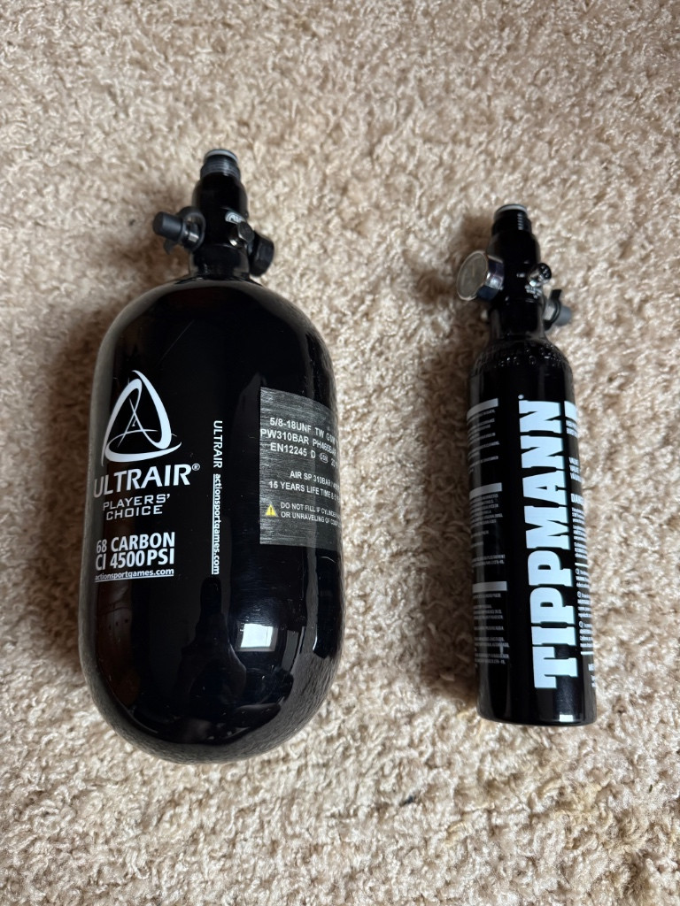 Prodam HPA lahve, obě 5x plněné Zbraň jsem už prodal pro nevyužití, tak zbývají lahve. Malá za 900,- Kč Velká carbonová za 4100,- Kč Mohu osobně dovézt.