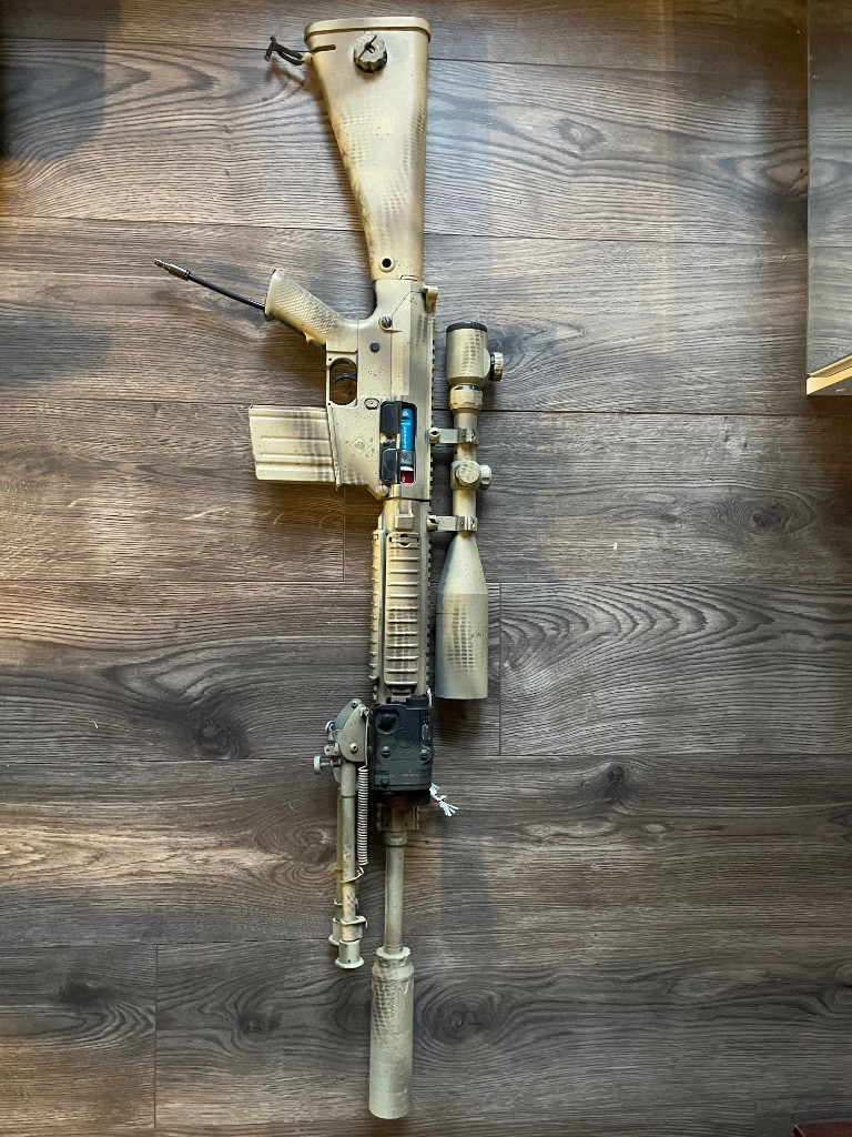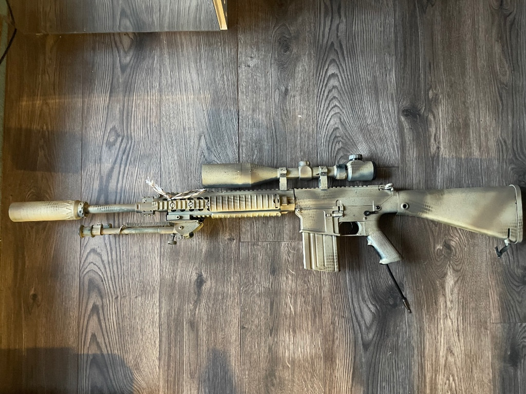 Prodám SR25 /M110 v hpa. System scalar s duálním solenoidem, plně nastavitelný systém využívající aeg trysky. Retro arms hop up komora, ml guma, přesná hlaveň, Epes tryska. Na těle laserem vypálené logo USMC Raiders. Zbrani chybí výpust závěru a kryt závěru je rozbitý viz foto. Cena je za plně osazenou zbraň jak je na foto+3x zásobník (optika,tlumič,harris, peq box,ris krytky). Možnost výměny za dron.
