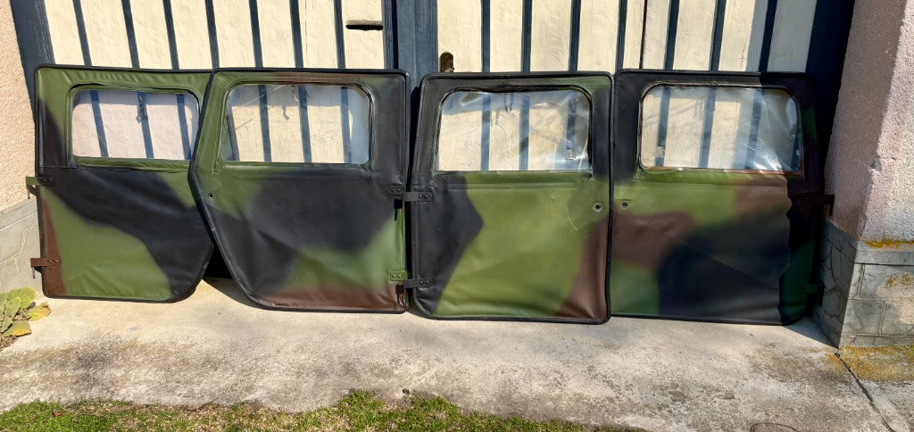 Nabízím komplet soft-top dveře pro Humvee 4-man. Všechny zipy funkční - okna funkční, celkově pěkný - použitelný stav. Stav dveří konkrétně (mohu zaslat detail fotku): - levé přední - stav 6/10 - horní část okna folie odpáraná od zipu, k sešití, ale dá se s tím fungovat - cena 3 000 Kč - pravé přední dveře - stav 7/10 - spodní pravý roh kousek odlepené folie od dveří, ke slepení, dá se s tím fungovat - cena 4 000 Kč - levé zadní dveře - stav 9/10 - bez viditelného poškození - cena 5 000 Kč - pravé zadní dveře - stav 10/10 - nové - cena 6 000 Kč Osobní převzetí Náměšť nad Oslavou, nebo Brno po dohodě. Mohu zaslat přepravní službou po dohodě, ale jen při koupi všech dveří. Mám jen tyto dveře - sundané z provozovaného Humvee. Více fotek dveří na Bazoši.