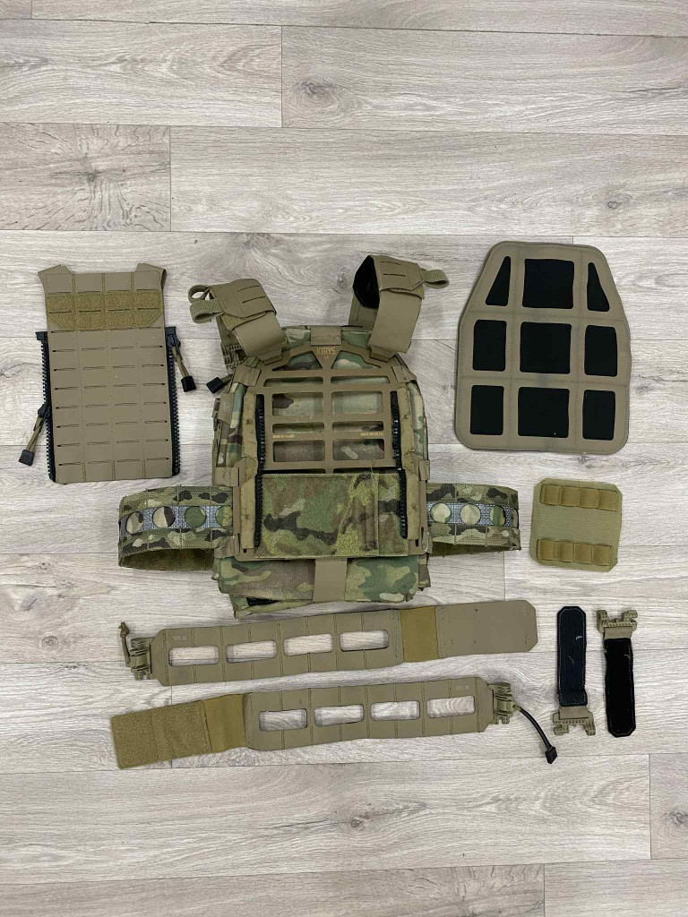 Husar Kirys nosič plátů - prasklý kousek kydexu viz. foto (nemá vliv na funkci) původní cumerbund se rozjel šev (nic co by neslo opravit), druhy cumerbund hezká kopie Ferro vel. L , plate bags multicam vel. L, zádový molle panel, chemlights holder