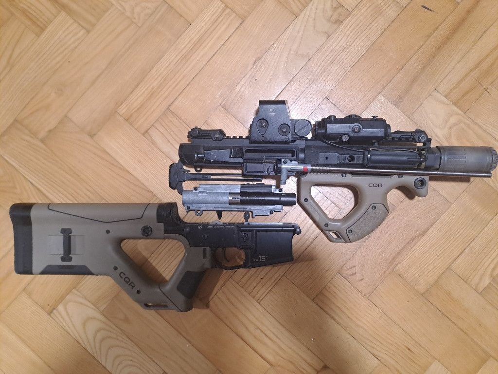 Prodávám svou upravenou sci-fi hračku. V základu měla dost solidní díly, nicméně jsem ještě vyměnil: Hlaveň- ocelová 6.01 protažená do tlumiče Tryska- kovový atyp ICS master mods Píst- komplet kovové zuby Hlava pístu a valce- tichý hliníkový set s dopadovými gumami Hop up- komora kovová základní ale maple leaf macaron pro guma a omega přítlak Válec- ocelový leštěný s krapet větším objemem vzduchu, kvůli prodloužené hlavni. Pružina AirsoftPro M120. Zbraň má dělený mechabox, vymena pružiny i dílů je tedy velmi rychlá. Výhodou oproti ostatním ar-15 od ICS je, že podává snad z jakéhokoliv zásobníku. Má lehce pod 1.7 joule. Super dostřel i přesnost. V ceně je i kolimator s ochrannym sklíčkem a custom made tlumič z 3D tiskárny, který přesně schová prodlouuenou hlaveň. Peg po dohodě možná taky.