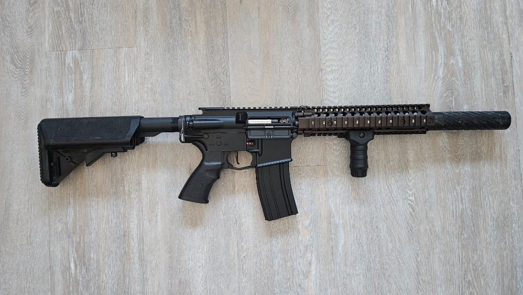Zdravím, z důvodu redukce sbírky prodávám svou stavěnou Mk18ku od ICS. Původní zbylo ale už jen tělo a ani to ne celé. Momentálně uvnitř pružina GD SP130 s výkonem 2.5J. Díky rychlovýměně ale není problém přehodit za slabší, případně klidně ještě silnější. Zbraň to v pohodě zvládne. Upgrade se skládá z: děleného RetroArms mechu s rychlovýměnou pružiny, vzduchotechnika EpeS s RetroArms pístem, Maxx válec, kola SHS 18:1, Jefftron Scylla Bluetooth procesorovka a bezuhlíkový motor Specna Dark Matter, dále komora Maxx pro ICS s 4UAD gumkou. Celé je to poskládané v ICS těle s ražením DD Mk18. Spoušť a záchyz zásobníku Maxx. Předpažbí v barvě Chaos Bronze s origo ražením, dovezené ze zahraničí, žádný ty "žlutý" hnusy. Celková pořizovací cena přesahuje 30 000,-. Jedinou vadou na kráse je chybějící natahovací páka. Možnost osobního předání s vyzkoušením, případně není problém zaslat videa funkčnosti/střelby nebo detailnější fotky.