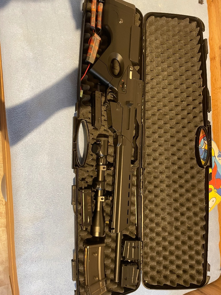 PRODÁM AIRSOFTKU JING GONG SL9 (JG1838) 1 ROK STARÁ PÁRKRÁT POUŽÍVÁNA NEPOŠKOZENÁ PŮVODNÍ CENA : 6000 CENA : 2500 Úsťová rychlost (m/s) :115 (m/s) Délka :1024 (mm) Délka vnější (minimální) :970 (mm) Délka vnější (maximální) :1024 (mm) Hmotnost :3860 (g) Délka vnitřní hlavně : 509 (mm) Materiál těla : Plast Počet kovových zubů pístu : 1 Velikost ložisek : 7 (mm) Materiál ložisek : Kov Trn pružiny : Plast Hlava pístu : Plast Tryska : Plast Materiál Hop-Up komory : Plast Typ konektoru : Malá Tamyia Točný / Tlačný : Tlačný Materiál zásobníku : Plast Barva : Černá Doporučená váha munice : 0,25g – 0,28g ZBRAŇ MÁ OPTIKU 3X9 2 BATERIE 8,4V 1600 MAH, NIMH 2 zásobníky 20bb + 1 zásobník 35bb 2 plničky na kuličky 1 Baterie 9,6V 1600 MAH Z airsoftem končím proto je cena takhle malá
