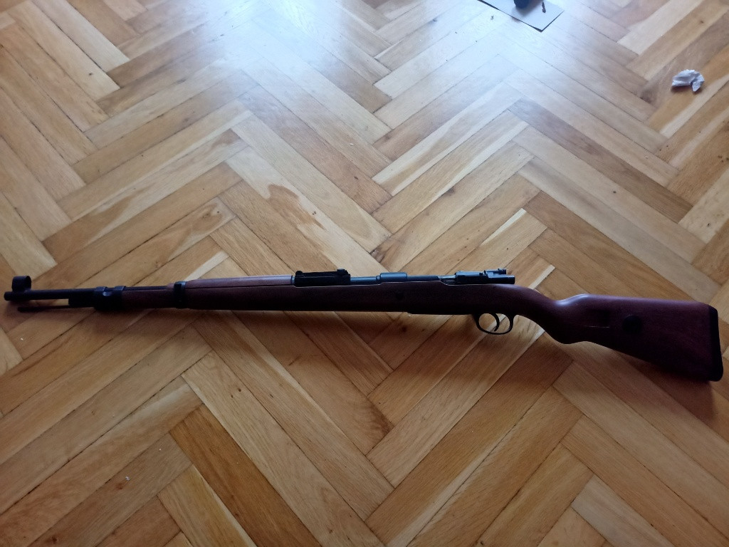 Airsoftová puška Karabina Mauser 98K v pružinové verzi ráže 6mm. Replika .Součástí balení je 3 ks nábojnic, do kterých se vkládá střelivo v podobě airsoftových kuliček ráže 6mm. Zbraň se přebíjí ručním pohybem páky závěru jako u originální verze pušky. Doporučená hmotnost použitelných 6 mm BB kuliček je od 0.20 do 0.25 g. Proti nechtěnému výstřelu je puška vybavena manuální pojistkou. Nechybí stavitelné hledí a funkce Hop-Up. ráže: 6mm Airsoft kovová hlaveň imitace dřeva celková délka: 112 cm nastavitelný Hop-Up pohon: pružina plně kovová hlava válce výkon: 1,5 J úsťová rychlost: 135 m/s, 430fps doporučená hmotnost střeliva: 0,20-0,25 g Jen osobní převzetí nebo poslat přes zásilkovnu 100 Kč