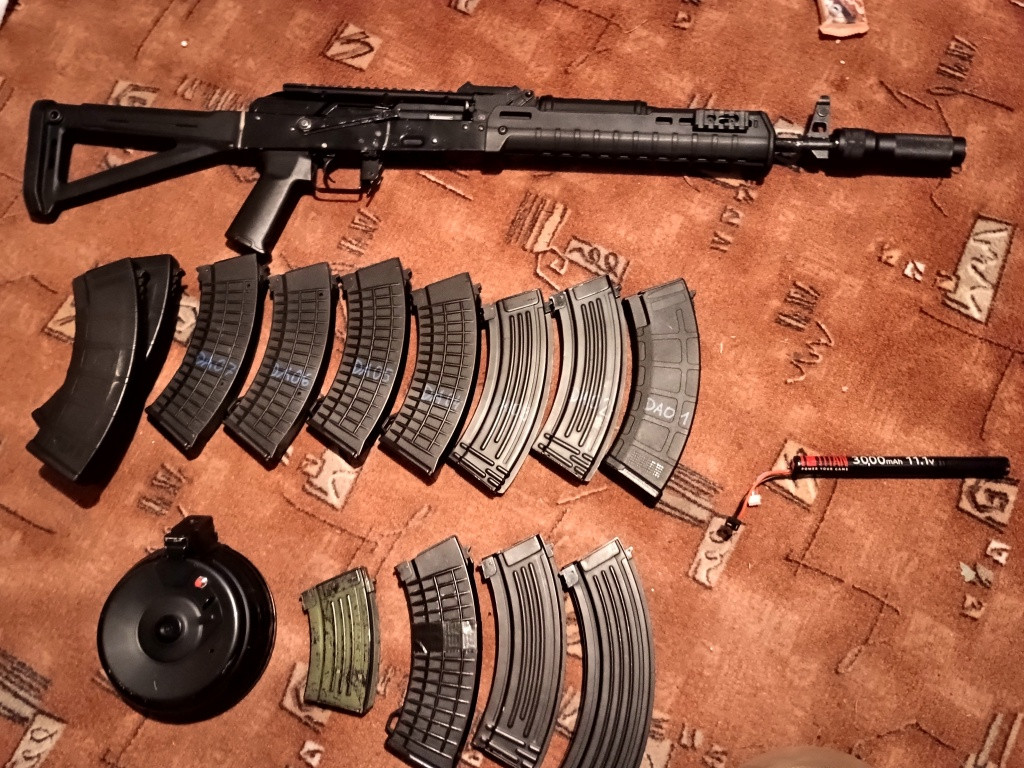 Prodám moderní Kalach od cymy cm077a s magpuly pažbou a předpažbím. Zbraň byla stavěná před několika lety v Airhardu a poladěná na 1,7 J na 0,30. Dále na zbrani QD point na magpul, Wolverine tlumič a RIS lišta na boku pro umístění svítilny. Ke zbrani přidám 7 tlačných zásobníků, 2 točné, 1 točný pro RPK, jeden točný malý, elektrický Buben na 2500 kuliček a 3 zásobníky na náhradní díly. Ke zbrani ještě dodám 11,1 3000 mAh baterii od značky Titán. Takhle jak je zbraň tak je to ideální zbraň pro začátečníka, zbraň už něco zažila, ale jestli začínáš s airsoftem tak tenhle Kalach udělá ještě velkou radost. Osobně Praha/Světlá nad Sázavou, jinak zásilkovna. Při rychlém jednání jsem ochoten slevit