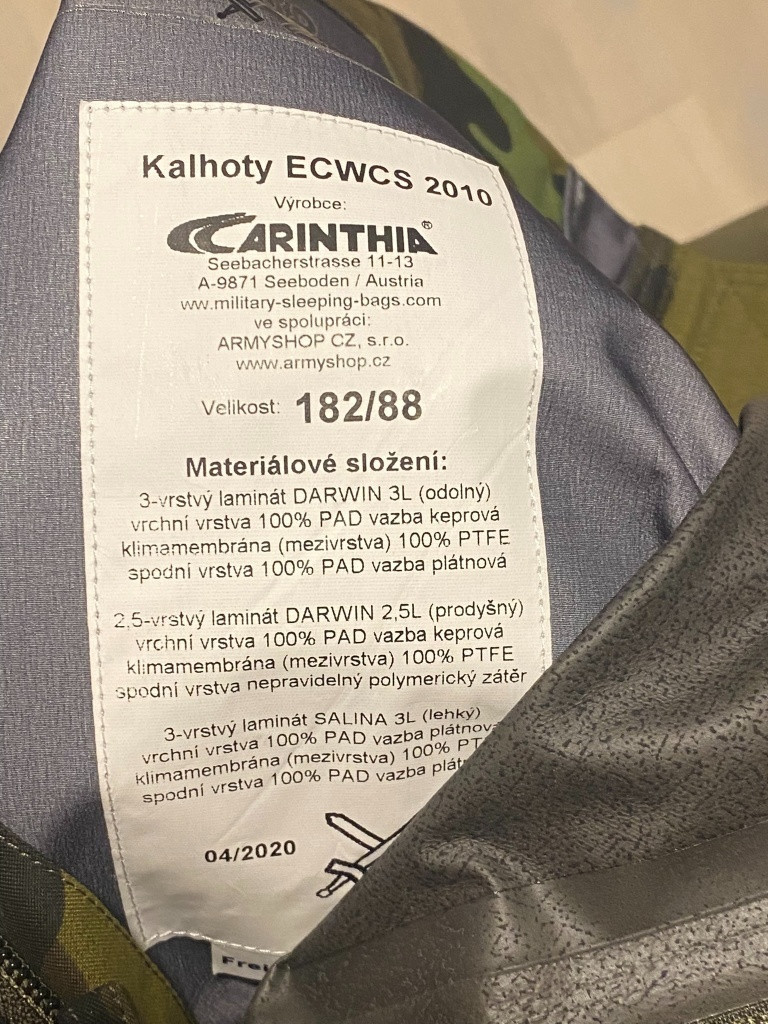 Nové nepoužívané kalhoty AČR - ECWCS 2010. Výrobce Carinthia. Velikost 182/88.