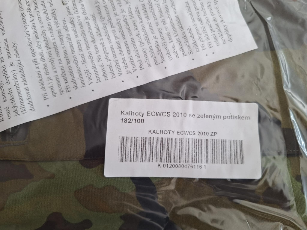 Kalhoty ECWCS 2010 originál AČR vz.95. Kalhoty s membránou do nepříznivých klimatických podmínek používané AČR. Použitý materiál zajišťuje ochranu proti vlhku větru a dešti. Nové, velikost 182/100. Cena 990,- Kč. Originální výstroj armády ČR. Inzerát platí do smazaní. Osobně nebo zaslání přes Zásilkovnu (hradí kupující), dobírka možná pouze po platbě poštovného předem. Poštovné Zásilkovna 90,- Kč, zaslání do Alza boxu 50,- Kč.