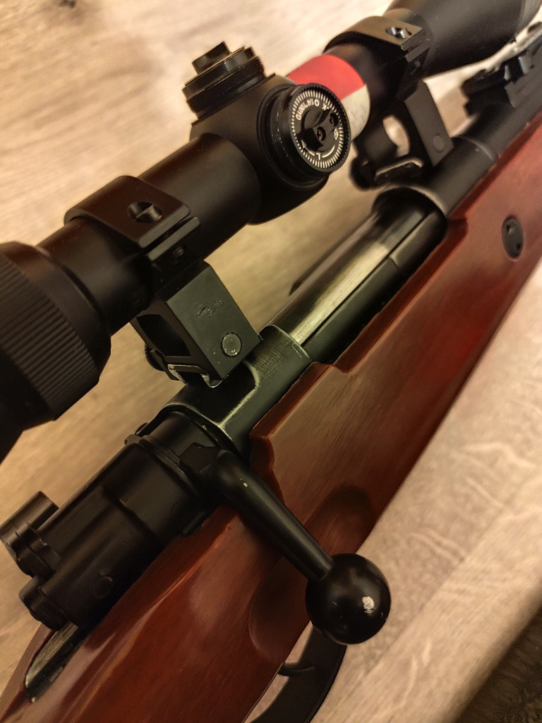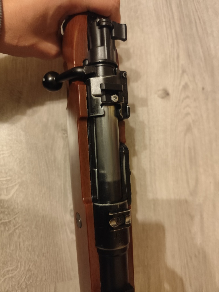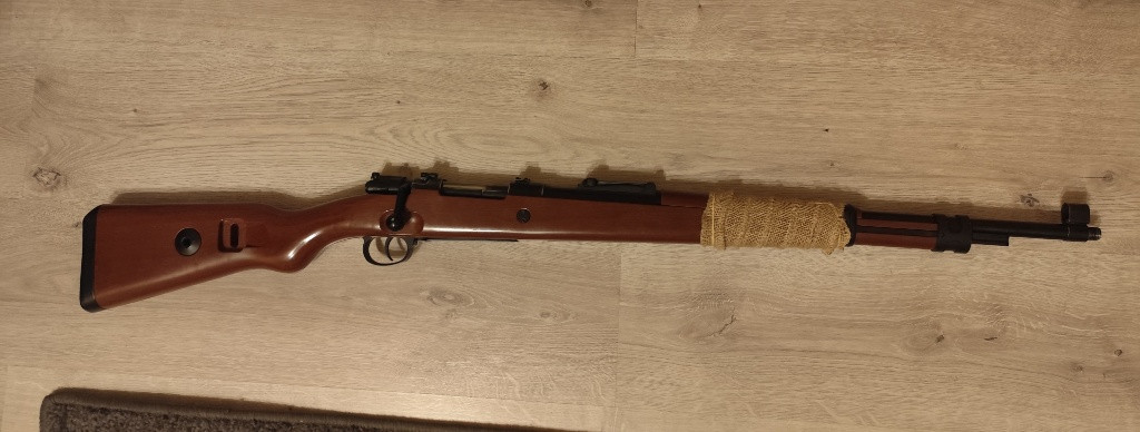 Prodám Karabiner 98k od S&T, Zbraň je plně VSR kompatibilní, takže jednoduchá na upgrade. Imitace dřeva, silnější m140 pružina AirsoftPro, dodělané držáky RIS pro optiku, závit na tlumič (14x1.5, nesedí na klasické tlumiče) tlumič v případě zájmu přidám ke zbrani za 200kc Plně funkční krásná manuální replika.