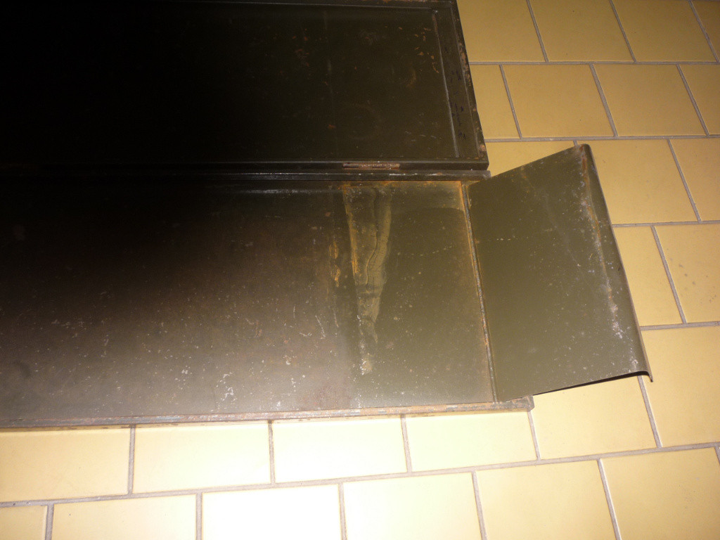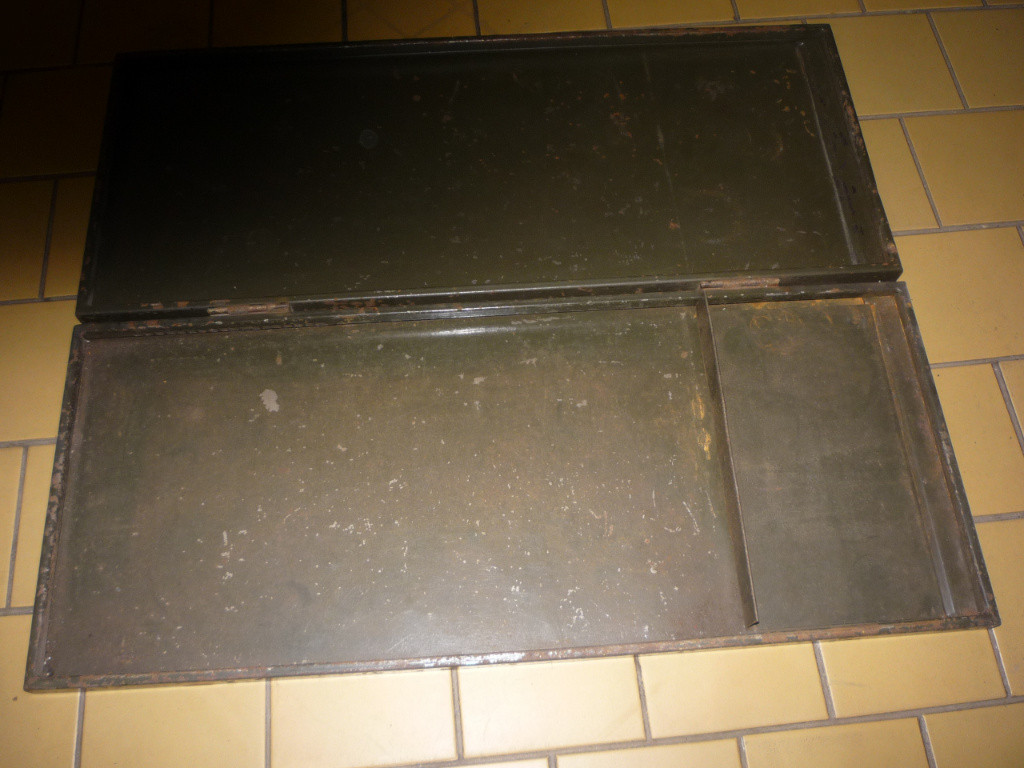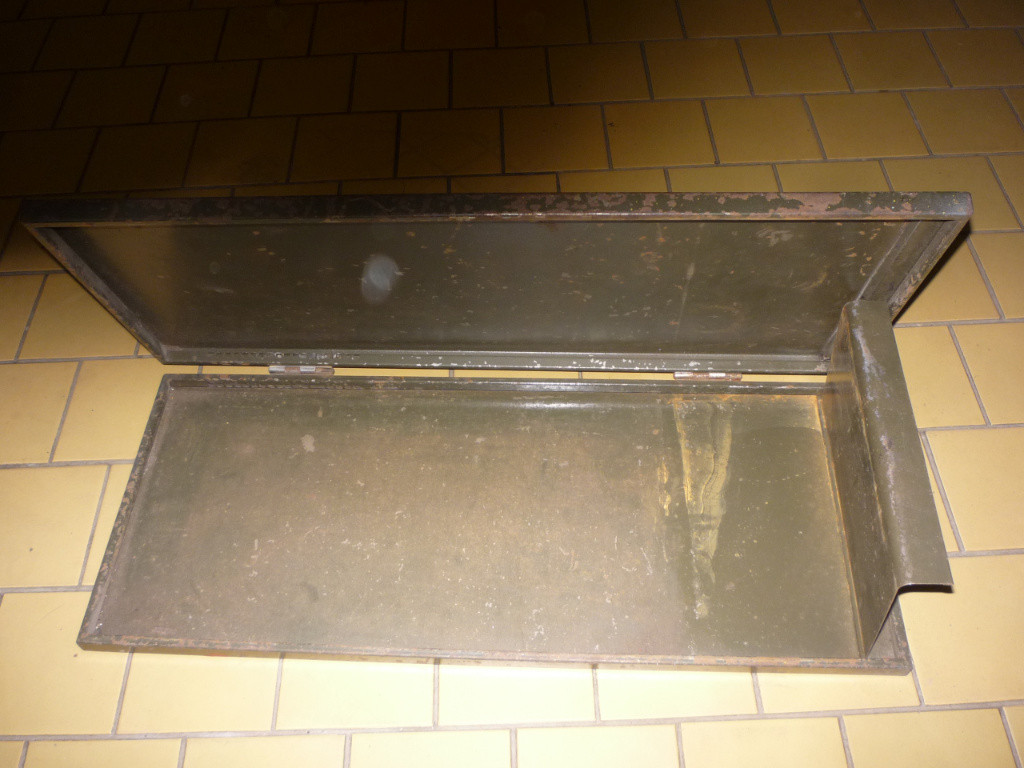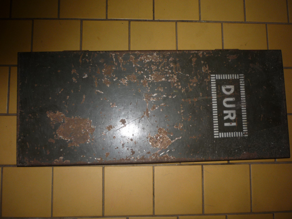 Nabízím plechovou kazetu, nalezenou ve starém autě KDF. Nevím zda to patřilo do výbavy, co v tom bylo nebo k čemu to sloužilo. Otvírá se to jako dvoustránková kniha,rozměry jsou cca 22 x 55 x 4 cm, je to nastříkané barvou khaki, místně orezlé, na víku je stříbrošedý nápis DURI. Děkuji i za případnou informaci k výrobku.