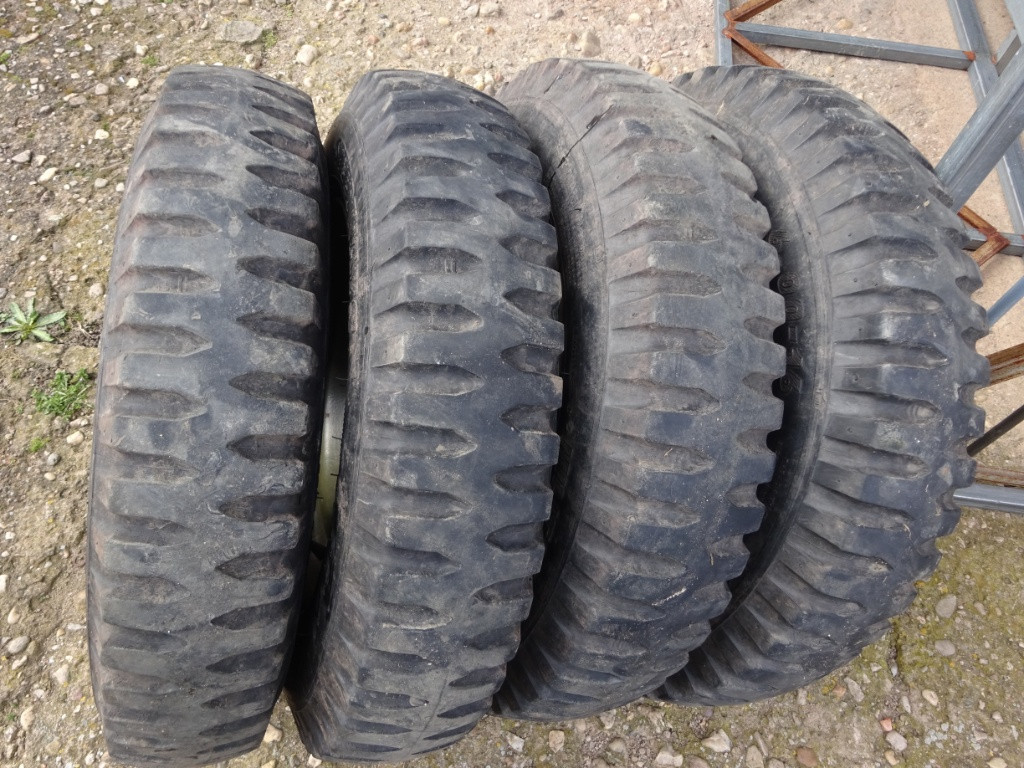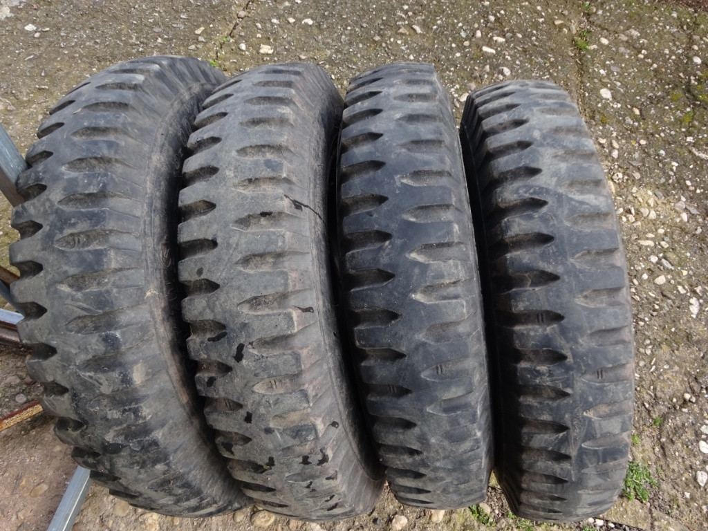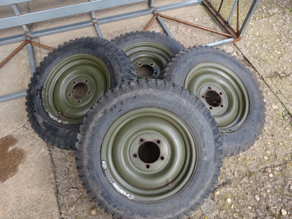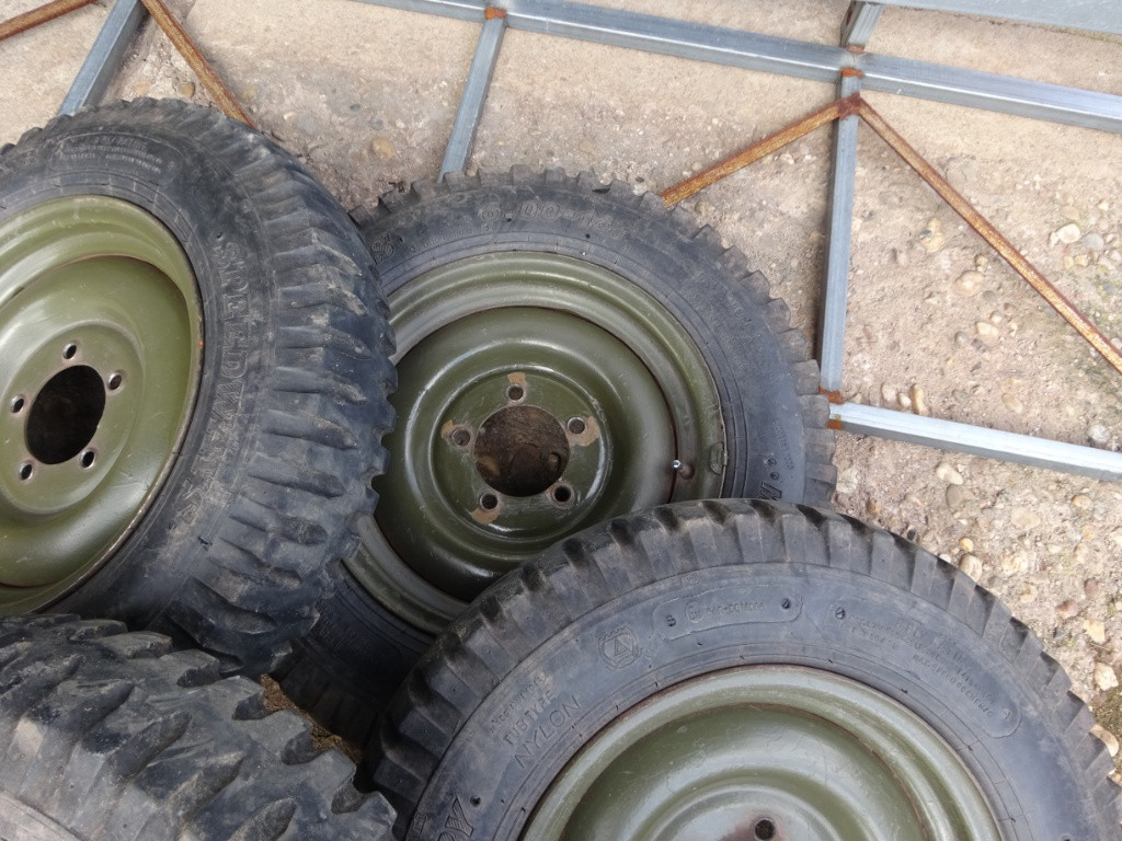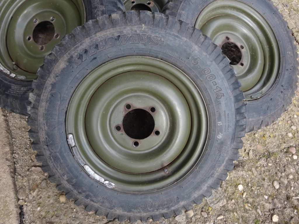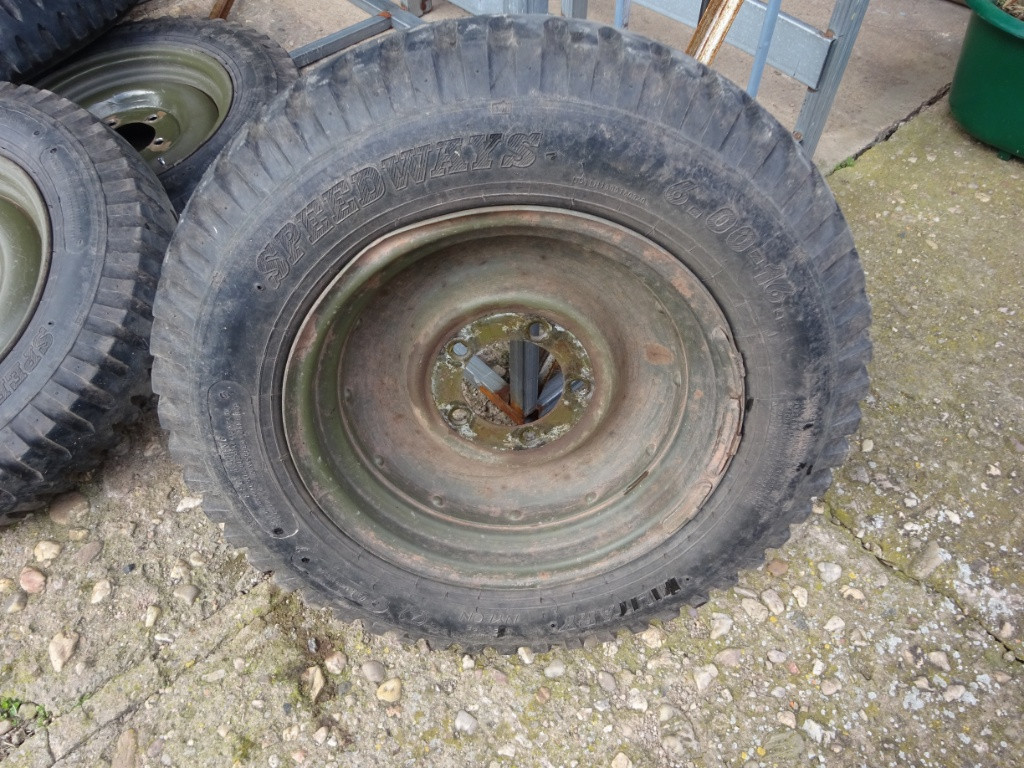 Prodám 4x kola na Hotchkiss M 201 nebo Jeep Willys. Pláště jeté Speed Ways 6x16. Stav viz. foto. Cena za vše.