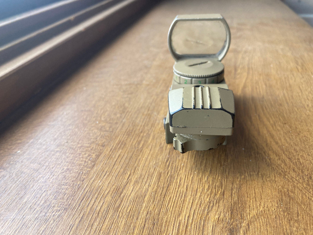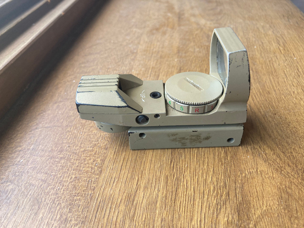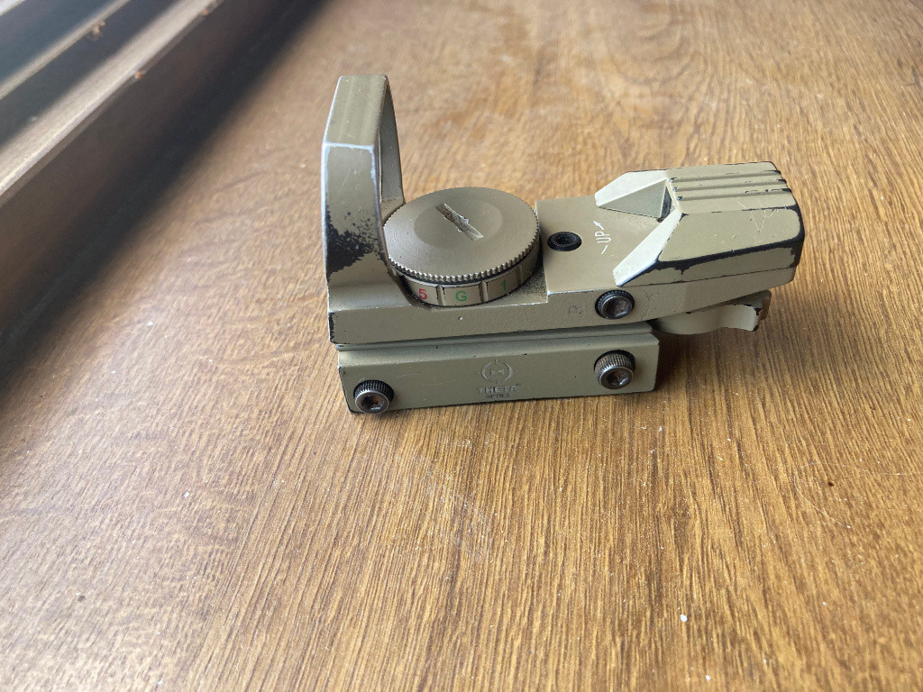 Prodám funkční kolimátor od Theta Optics v pískové barvě. Byl dost používaný, ale až na ztrátu barvy v některých místech je plně funkční. Má čtyři typy zaměřovacích obrazců a je schopen svítit v červené a zelené barvě s různými intenzitami.