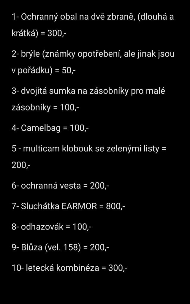 sluchátka - prodáno obal na zbraň - prodáno kombinéza - prodáno Cenovky viz. foto.......... Posílám na dobírku nebo osobní předání........Pro více info napiš na....... E-mail: tonda.nagy@centrum.cz..... SMS: 608 755 433