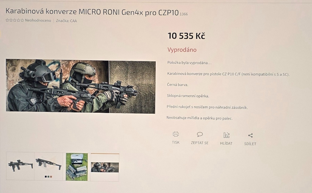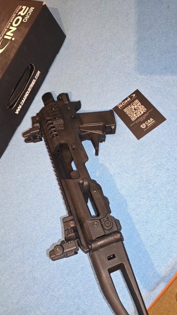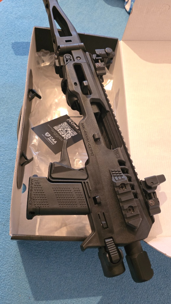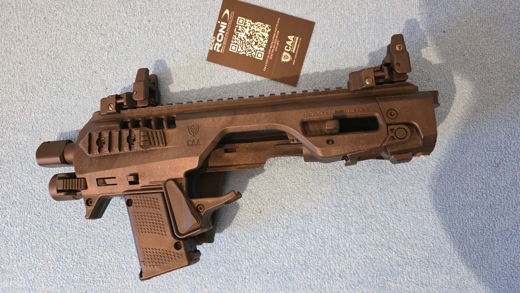 Karabinová konverze MICRO RONI Gen4x pro CZP10C a P10F. Konverze má nastříleno cca 400 ran,poslední rok po nákupu Eva 3 už ležela jen v trezoru.Mechanická sklápěcí mířidla + integrovaná svítilna jsou součástí prodeje.Konverzi jsem střílel s kolimátorem,drží nástřel po vyndání zbraně.Celkovy stav perfektní.Pořizovací cena 10.535kč + svítilna,prodám za 8500kč.