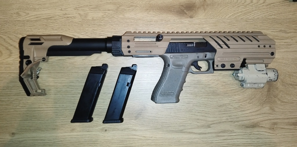 Nabízím novou konverzi s Glockem WE 18c v základu se 2 zásobníky a svítilnou s červeným laserem. Součástí jsou i mířidla pro Glock pro samostatný provoz bez konverze. Osobní převzetí Chrudim, nebo zásilkovna.