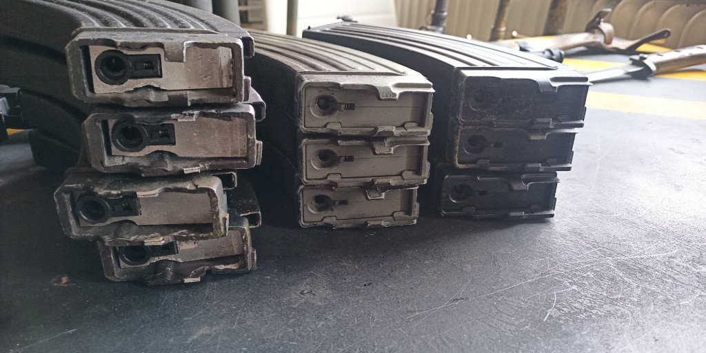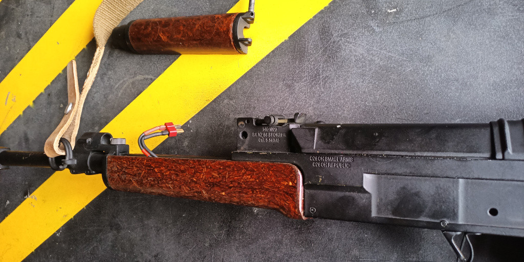 Zbraň je po servisu, měněna byla ložiska a motor za zátěžový, jinak je zbraň v základu. Co se týká vnějšku, je na ní předpažbí z ostré a pažba je upravena, aby se v otevřené poloze neviklala. Ke zbrani přidám 6 klasických zásobníků a 4 delaborované s vložkou z MP5 zásobníku (tyhle zásobníky potřebují trochu péče a dodělání). Navíc origo popruh a bajonet. Při rychlém jednání přidám i baterii. (TFH)