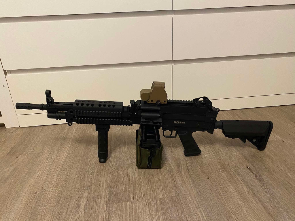 Prodám zmíněný kulomet. Byl na jedné akci, potom nehraný. Prasklá hop-up gumička, jinak všechno v pořádku. Prodám bez příslušenství. Preferuji osobní předání v Praze. M249 MK46