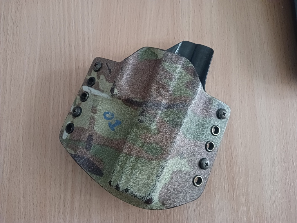 Prodam kydexové pouzdro od českého výrobce RH Holsters.Pouzdro bylo zakázkově děláno pro glocky 17 od Marui/We,které maj oproti ostré verzi lehce jiné-širší rozměry a tak se do standartně prodávaných pouzder nevejdou.Průvleky na opasek maj standartní šíři 40mm,barva Multicam.Pouzdro už má něco za sebou,jsou zde kosmetické vady jako oškrábaná barva a drobné odřeniny/škrábance.Dále gumové distanční podložky jsou mírně popraskané.Avšal nic co by se nedalo za pár korun vyměnit,pouzdro bude sloužit nadále skvěle.