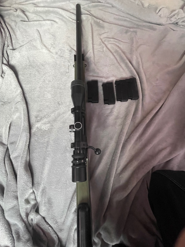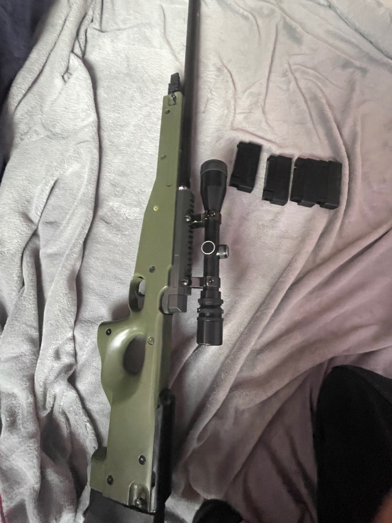 L96 vylepšena lze vyměnit se 4 zásobníky a optikou byla na pár akcích lehce pošrábaná hlavěn je poškrabaná zbraň je jinak plňe funkční