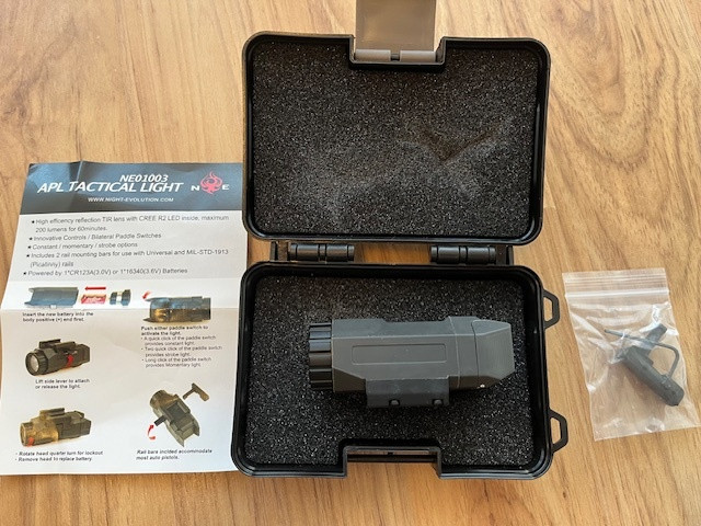 Prodám LED taktická pistolová svítilna APL Night Evolution, ,Anareus, minimálně používaná, plně funkční, doložím fakturu. CREE LED modul s 200 lumeny v plastovém těle. Montáž na 20mm RIS. Pohon na 1x CR123 (3V). Délka: 80mm. Váha: 70g. Cena nová 1690Kč, nabízím za 800Kč. Zásilkovna a nebo osobní předání Praha. https://www.anareus.cz/cs/svitilny-na-airsoft-pistole/11679- led-takticka-svitilna-apl-cerna-NE063.html