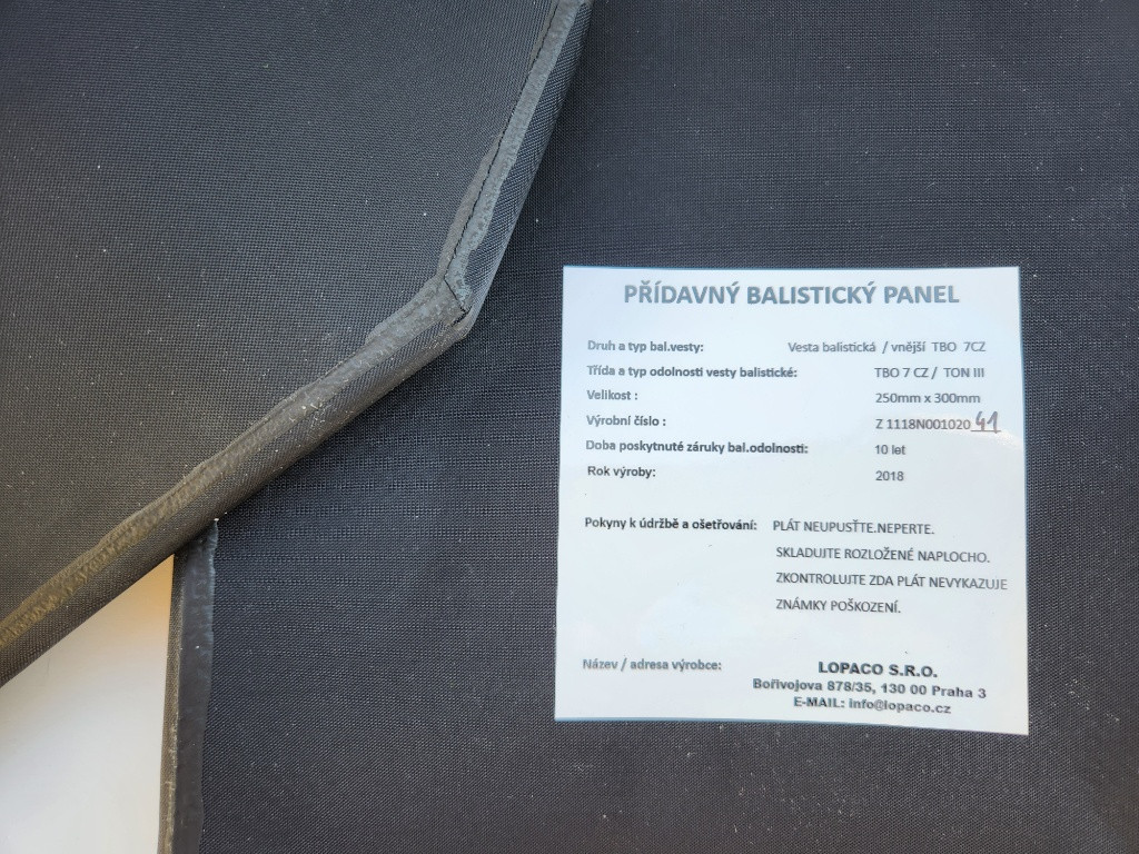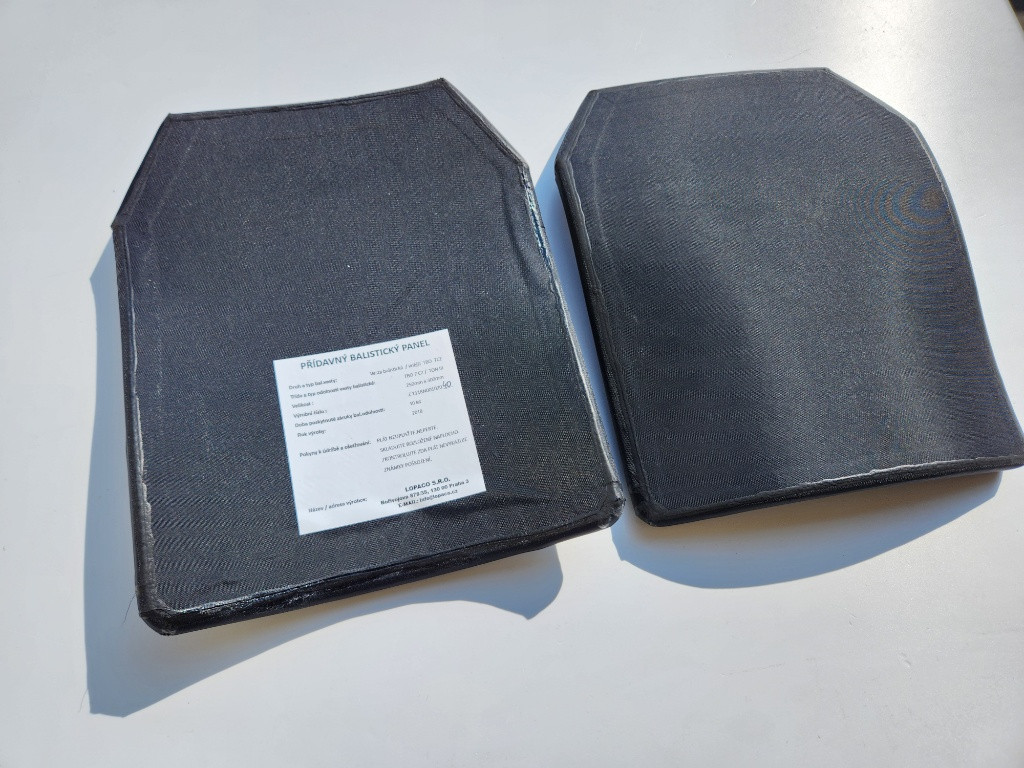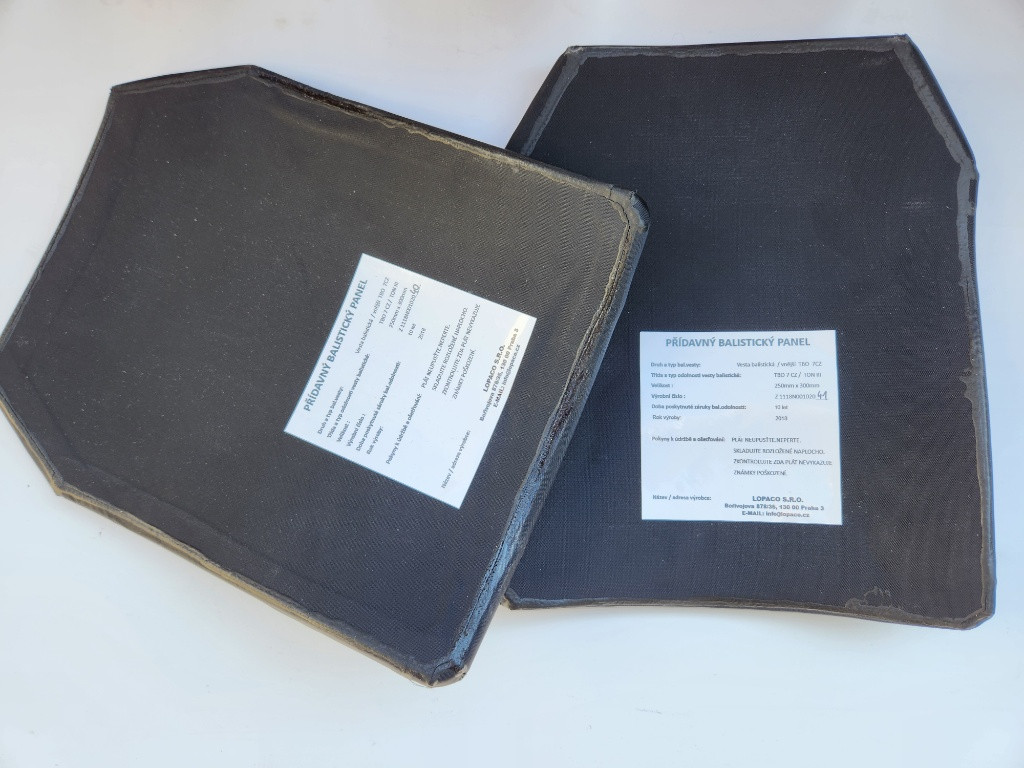 Nabízím k prodeji přídavné balistické pláty do vesty nebo nosiče. Velikost 25x30cm,výrobce LOPACO.Balistická odolnost TBO 7CZ,rok výroby 2018.Pláty byly ve vestě a nesou známky použití,někde se začala krabatit ta vrchní textilní vrstva tak byly vyřazené.Jinak jsou v pořádku bez poškození a můžou ještě dobře posloužit. Cena za oba (přední + zadní) 6500kč + zásilkovna.Obdobné nové pláty stojí třeba 9000kč/kus.