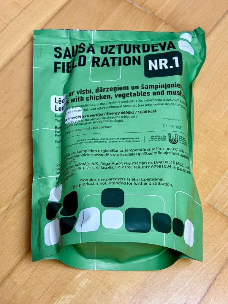 | Lotyšská vojenská potravinová dávka MRE 12h Menu 2 Zelenina s kuřecím |