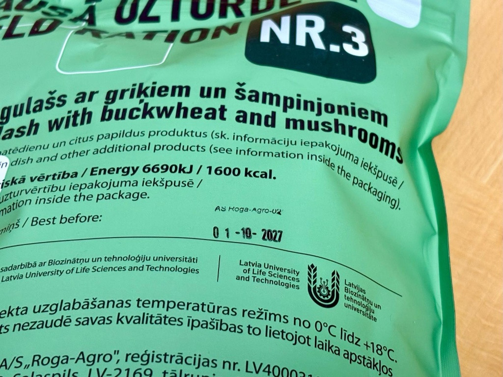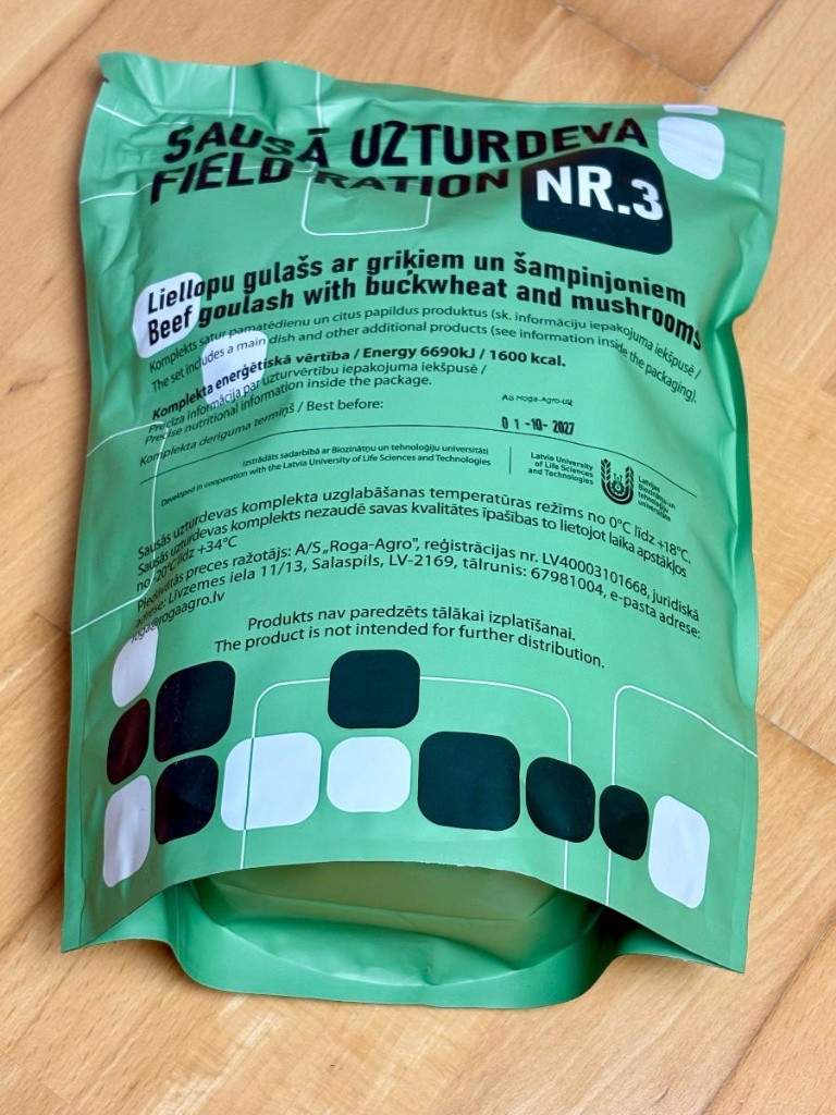 | Lotyšská vojenská potravinová dávka MRE 12h Menu 5 Brambory s masem |