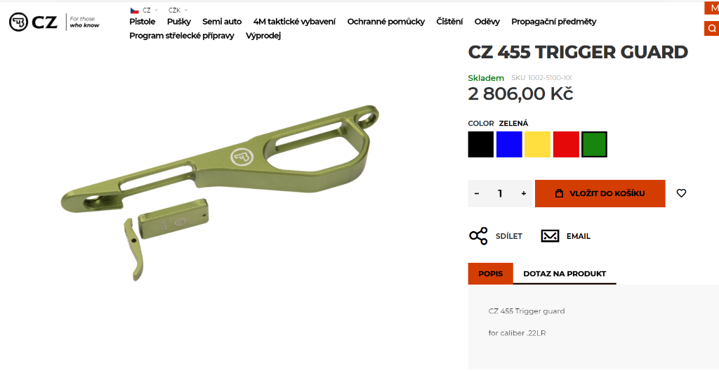 Prodám tuningový díl pro cz 455 od CZUB.Jedná se o lučík,dno zásobníku a páčku pro vyjmutí zásobníku.Nové nepoužité - cena v CZUB je 2806kč,prodám za 2000kč+ 110kč dobírka Zásilkovna.K prodeji dvě sady.