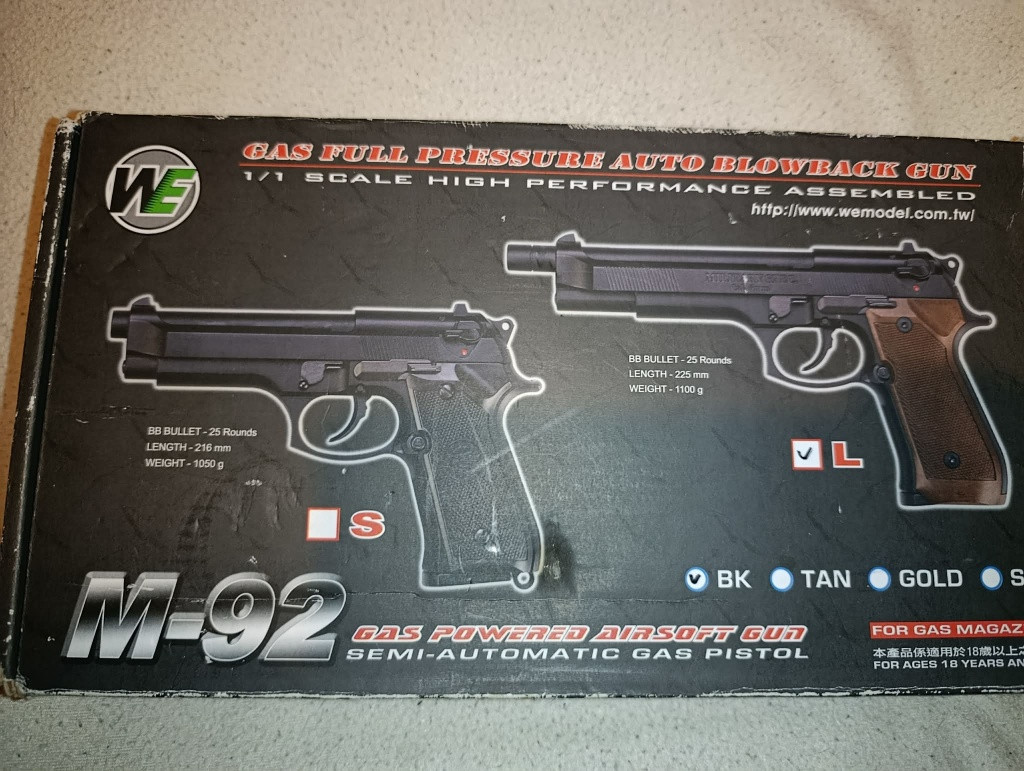 Prodám GBB pistoli M-92L od značky WE. Zbraň byla jen vyzkoušena, na akcích nikdy nehraná. Original krabice a jeden zásobník.